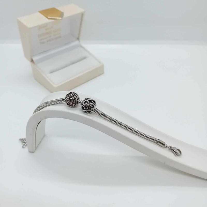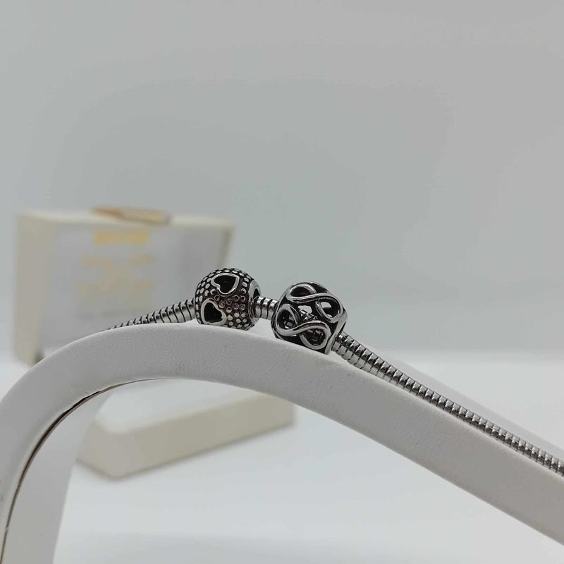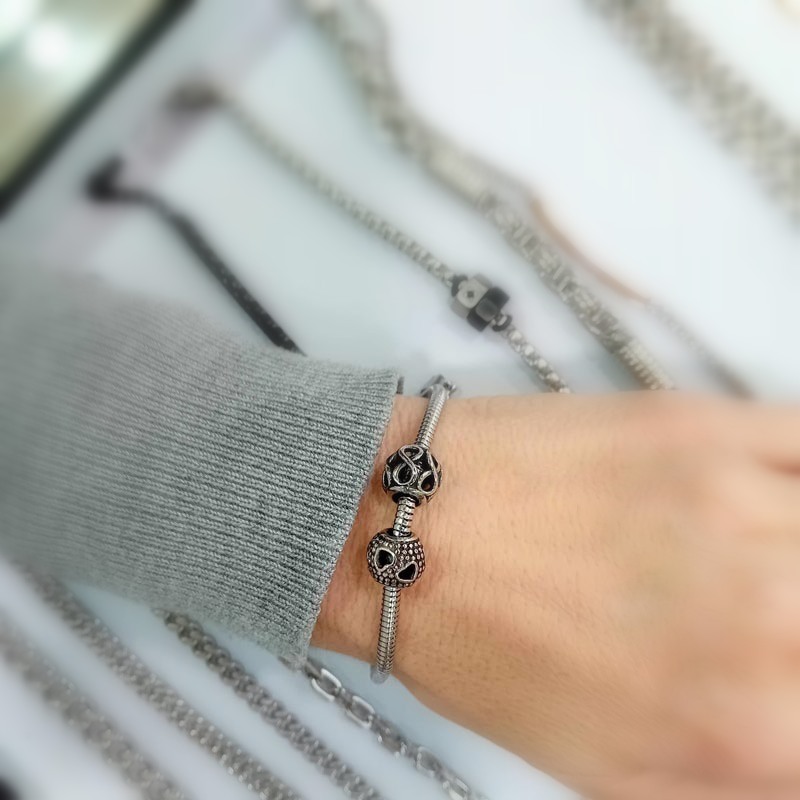 Όμορφο μοντέρνο βραχιόλι γυναικείο , από ατσάλι με δυο στελέχη , μπίλιες, η μια μπίλια με διάτρητες καρδούλες και η άλλη με διάτρητα σύμβολα του άπειρου.