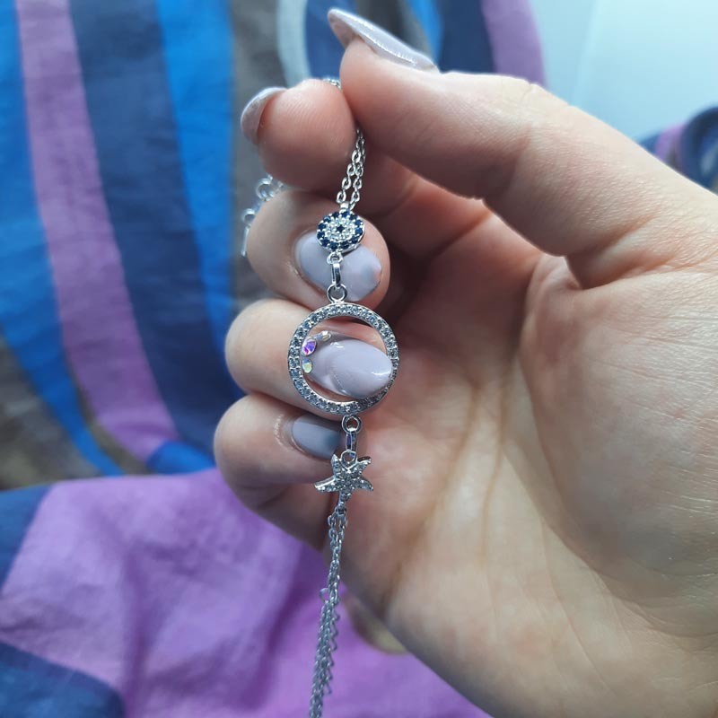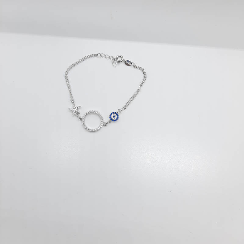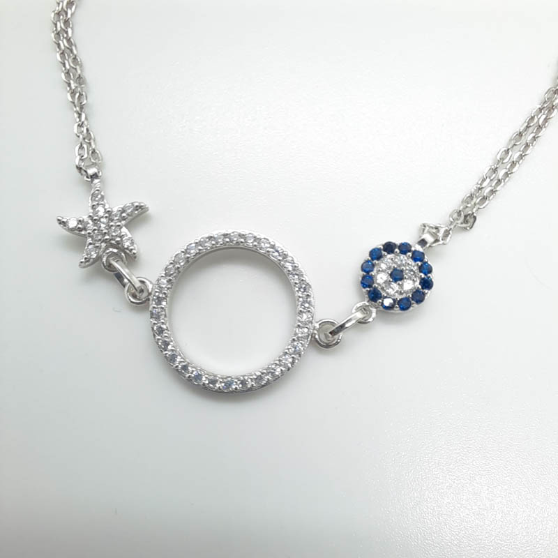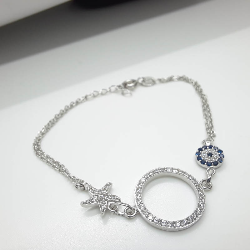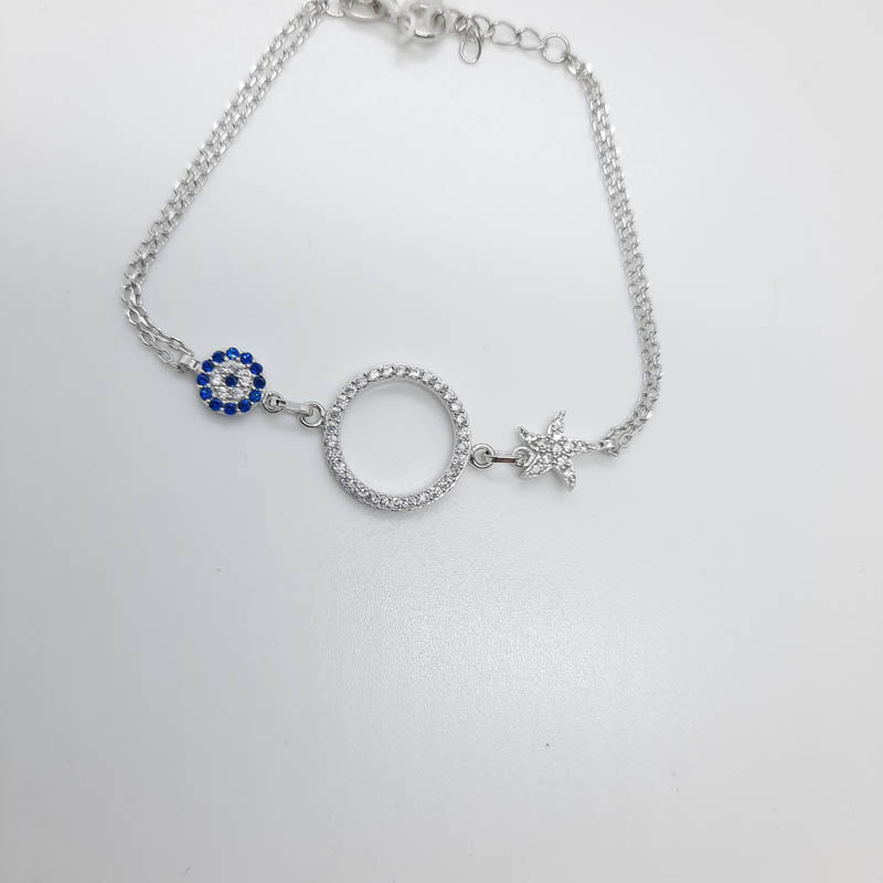 Εντυπωσιακή πολυτελής εμφάνιση με βραχιόλι από ασήμι 9.25 με διπλή αλυσίδα, κεντρικό μεγάλο κρίκο στην μέση, αστερία και ματάκι, όλα σύμβολα τύχης στολισμένα με άφθονα λευκά ζιργκόν .