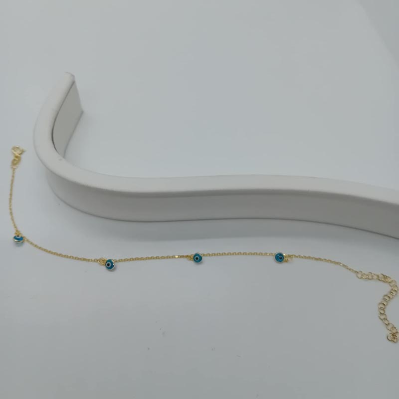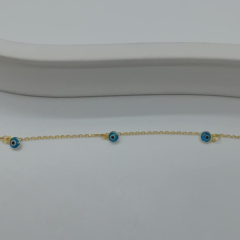 Με 4 μικρά μπλε ματόχαντρα στην αλυσίδα του αυτό το μοντέρνο βραχιόλι ποδιού από επιχρυσωμένο ασήμι θα χαρίσει στον αστράγαλό σας μια έντονη καλοκαιρινή πινελιά !