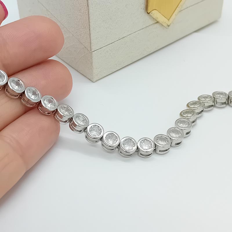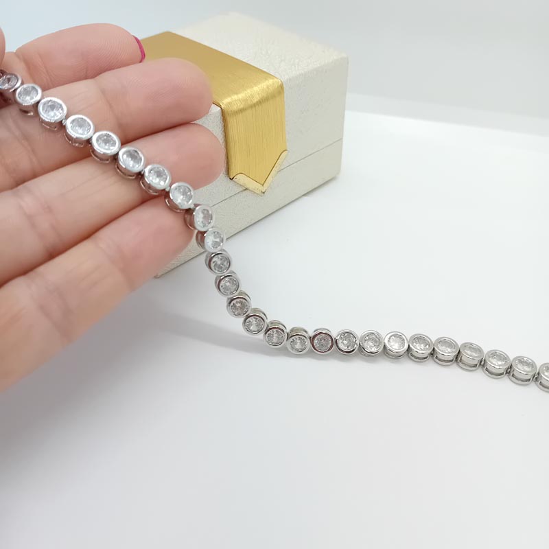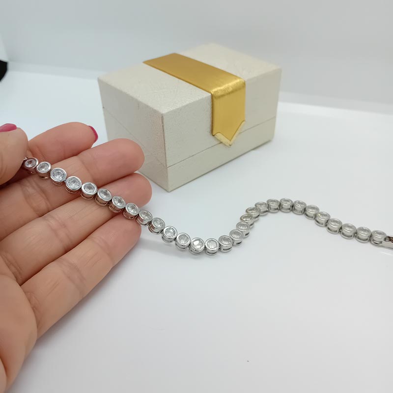 Ντύνει τις επίσημες εμφανίσεις σας με αστραφτερή λάμψη! Βραχιόλι "ριβιέρα" από ασήμι επιπλατινωμένο 925 με 30 λευκά ζιργκόν σε κυκλικό design.