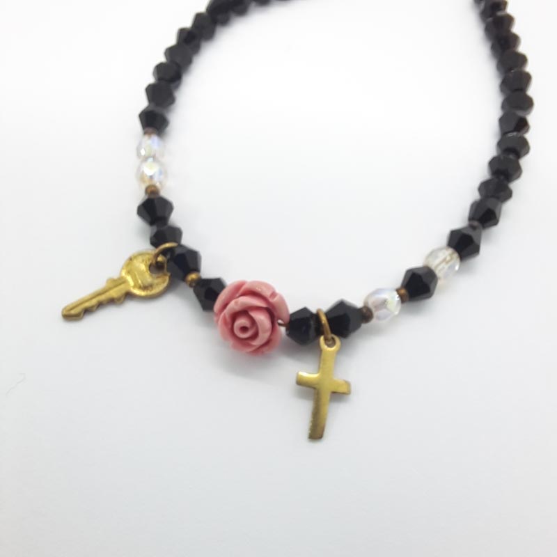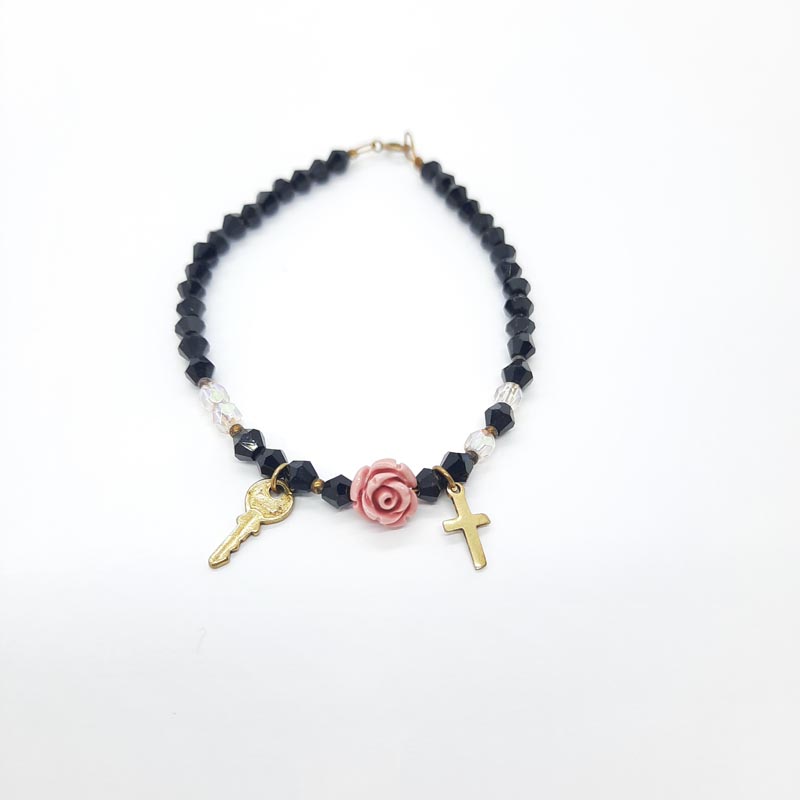 Μοντέρνο και εντυπωσιακό φω βραχιόλι με μαύρες χάντρες , κεντρικό ροζ τριαντάφυλλο και μεταλλικά στελέχη, σταυρό και κλειδί.