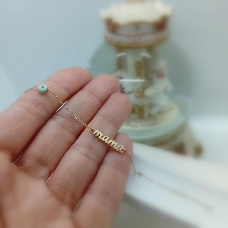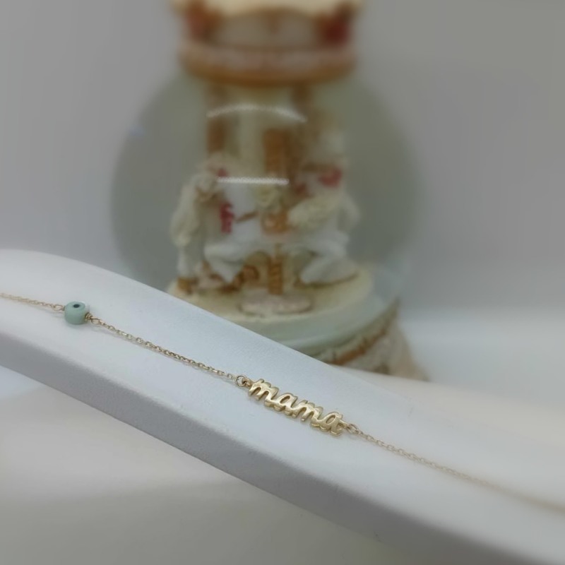 Νέα μαμά, ένα υπέροχο βραχιόλι για σένα ! Από χρυσό 14 ΚΑΡΑΤΙΑ , με λεπτή αλυσίδα, λέξη mama και ματόχαντρο σε γαλάζια απόχρωση.