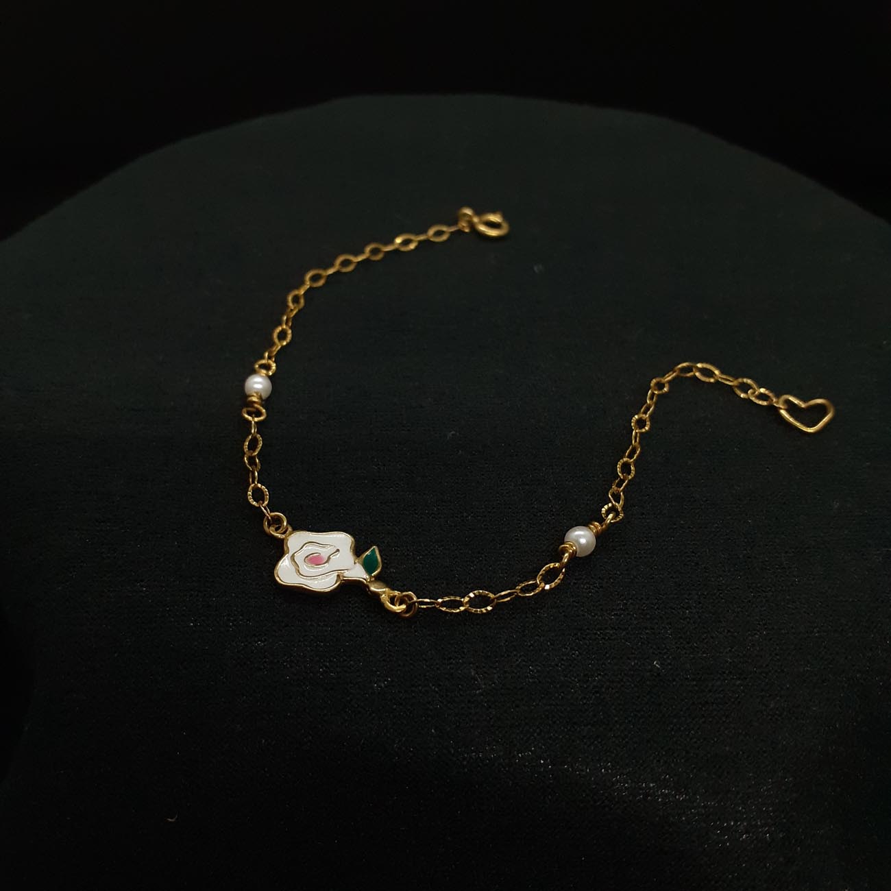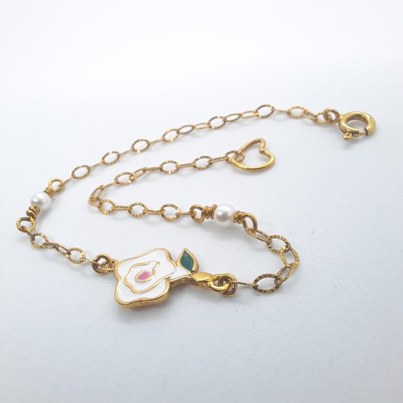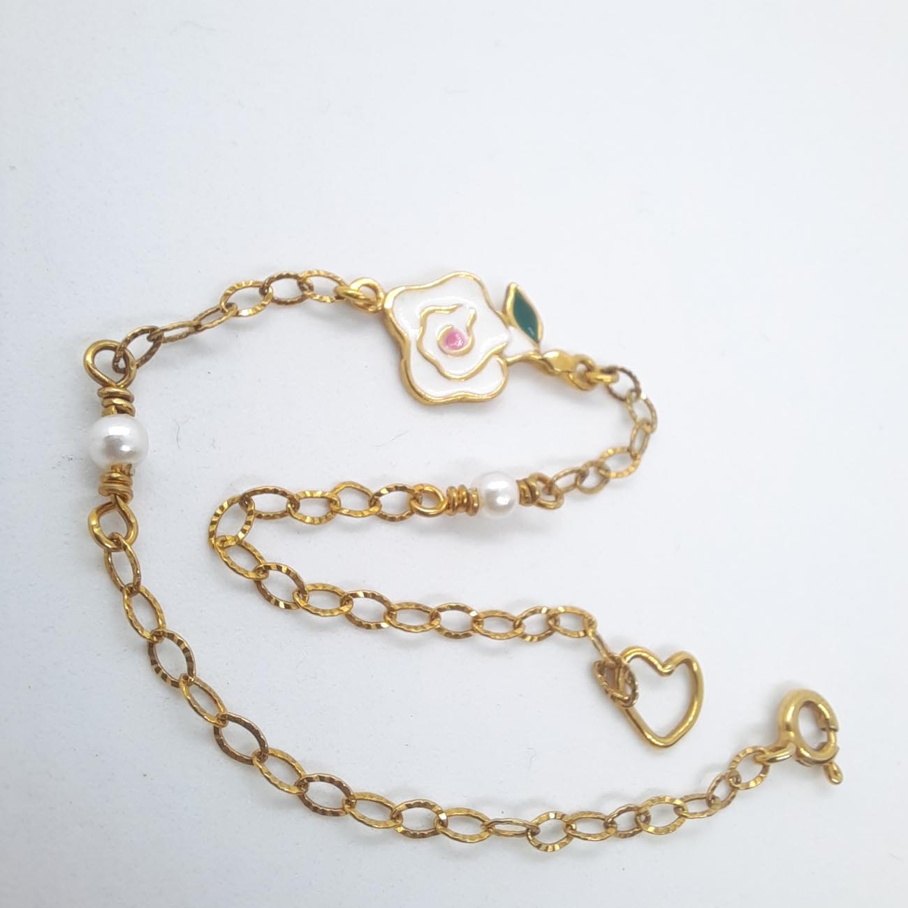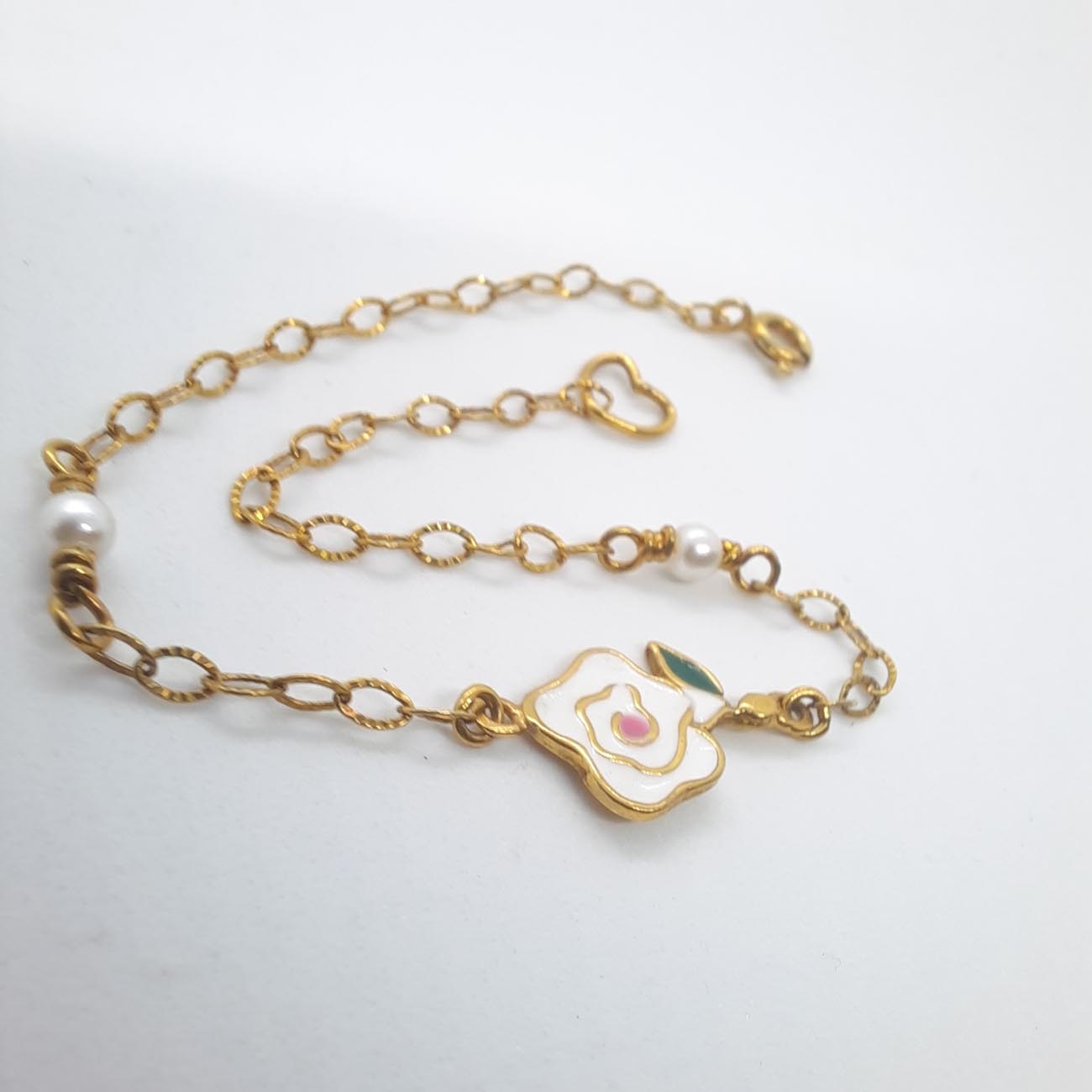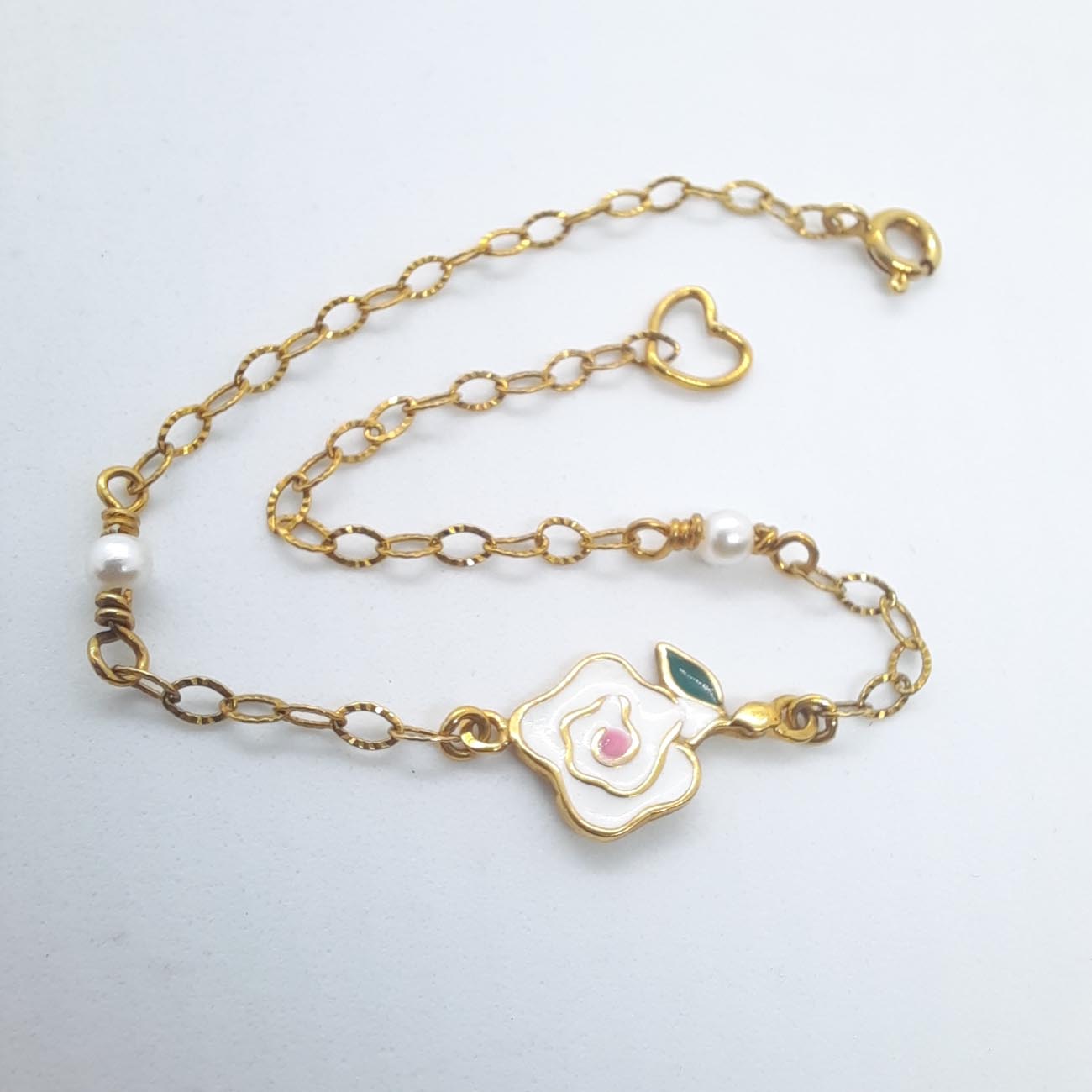 Βραχιόλι επιχρυσωμένο με ένα κεντρικό πανέμορφο τριαντάφυλλο από λευκό σμάλτο και 2 πέρλες! Ένα ρομαντικό δώρο, μια τρυφερή χειρονομία!