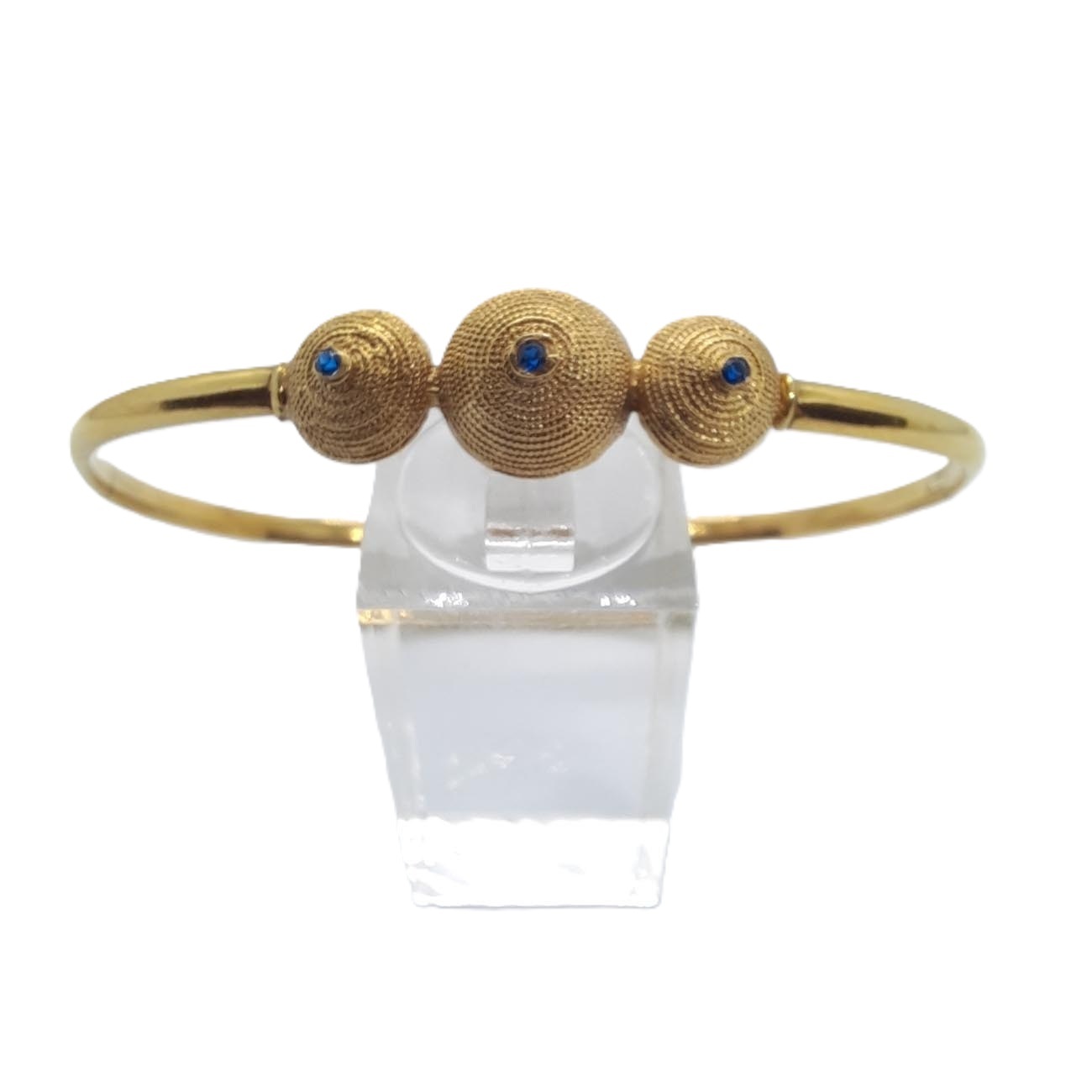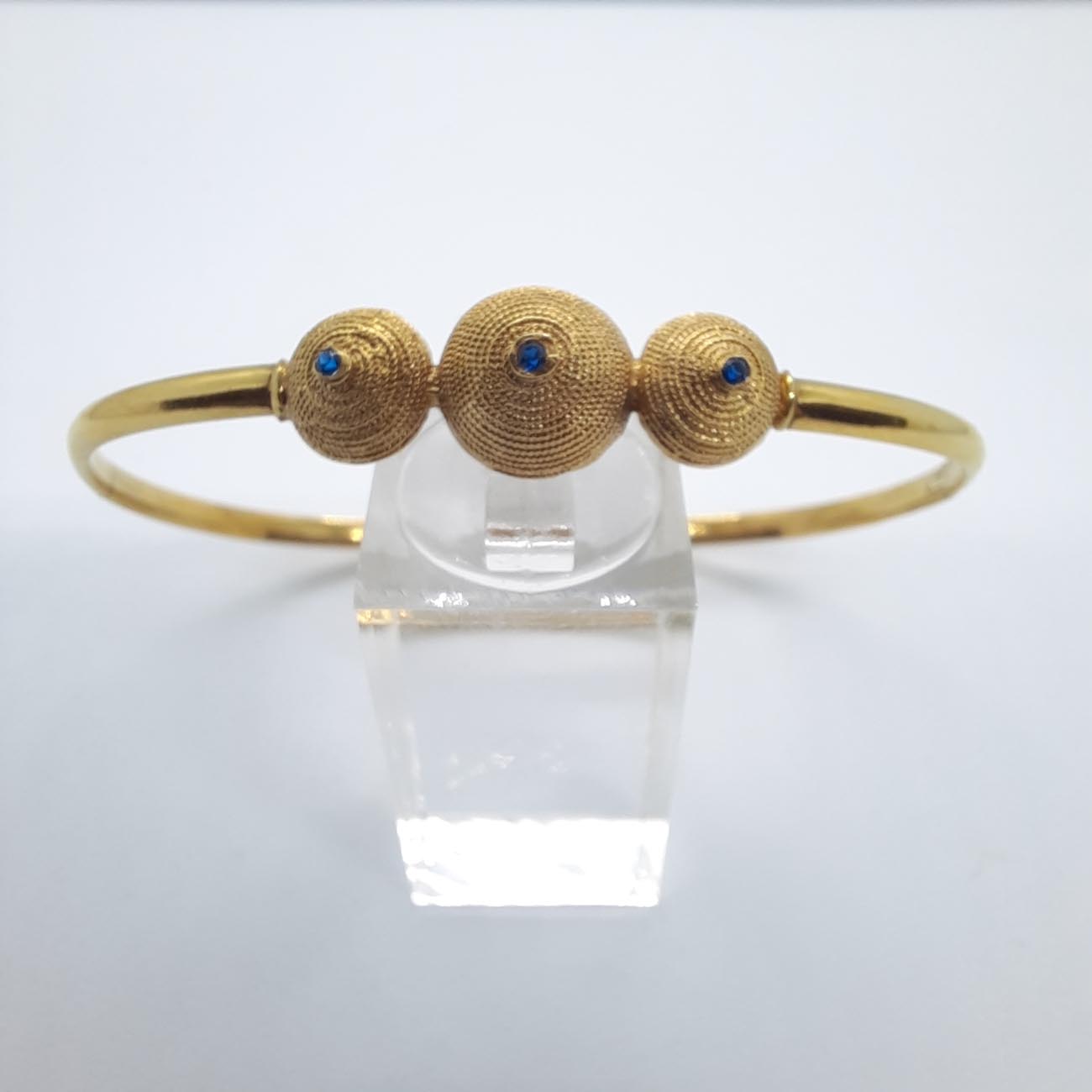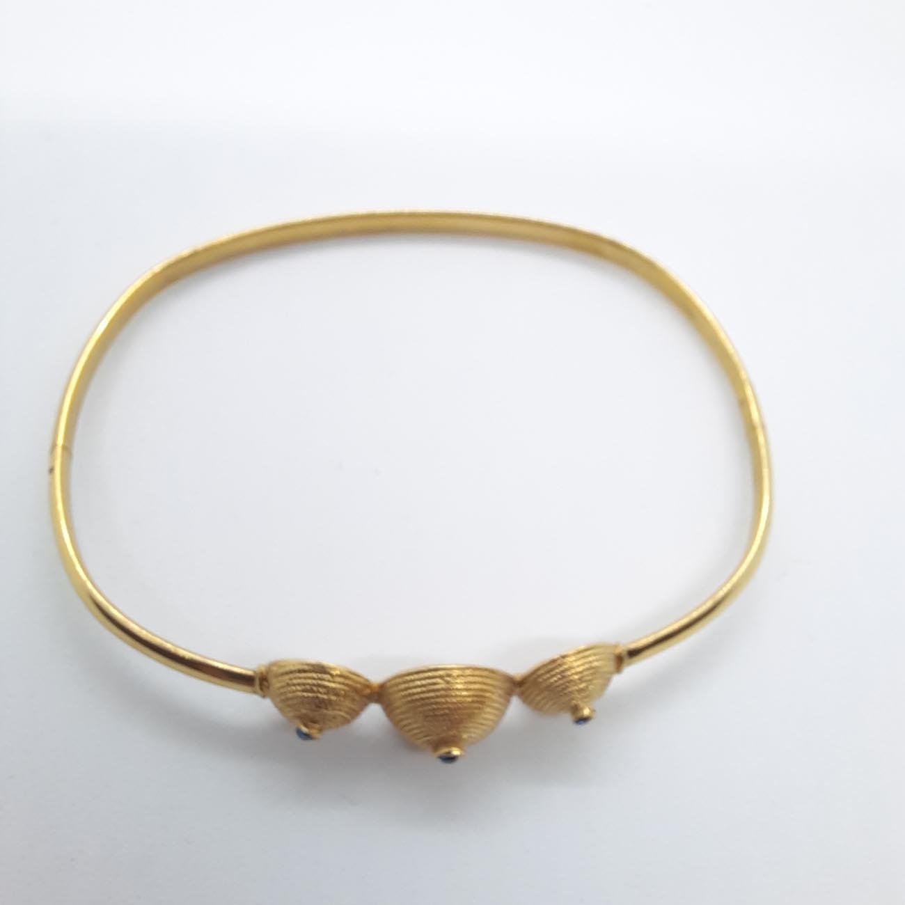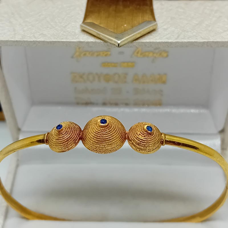 Μυθικό κόσμημα! Η τέχνη της ΑΡΧΑΙΑΣ ΕΛΛΑΔΑΣ στο βραχιόλι από χρυσό 14 ΚΑΡΑΤΙΩΝ, με σκάλισμα,3 τρούλους και 3 μπλε μικρά ζαφείρια, εκφράζει μια αρχοντική προσωπικότητα που εμπνέει σεβασμό και θαυμασμό.