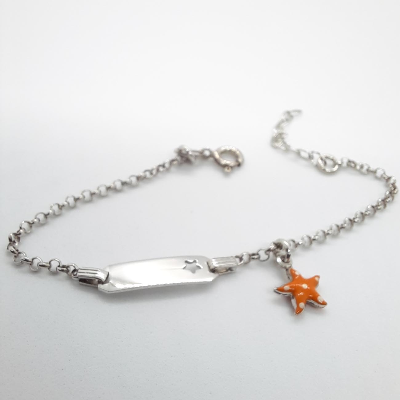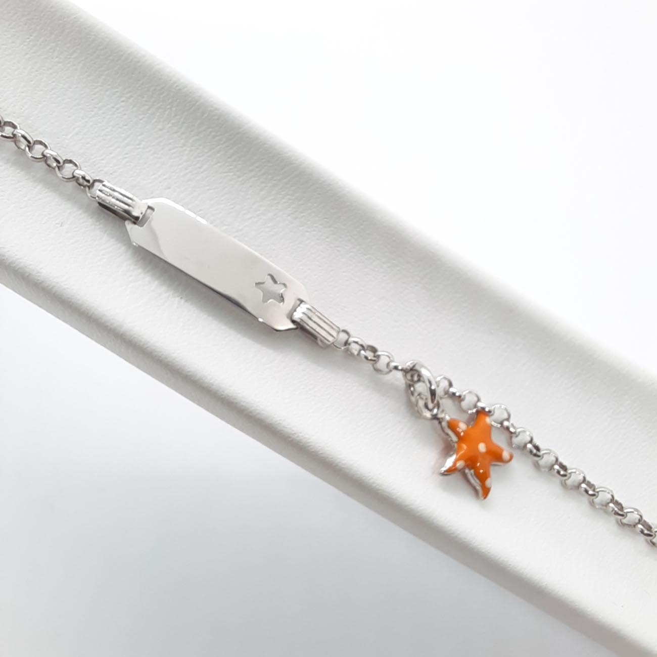 Πολύ όμορφη και μοντέρνα ταυτότητα για το κοριτσάκι σας , από ασήμι 9.25, με μικρή πλακέτα με διάτρητο αστεράκι, με δυνατότητα χάραξης μονογράμματος/ονόματος και κρεμαστό αστερία με πορτοκαλί σμάλτο.