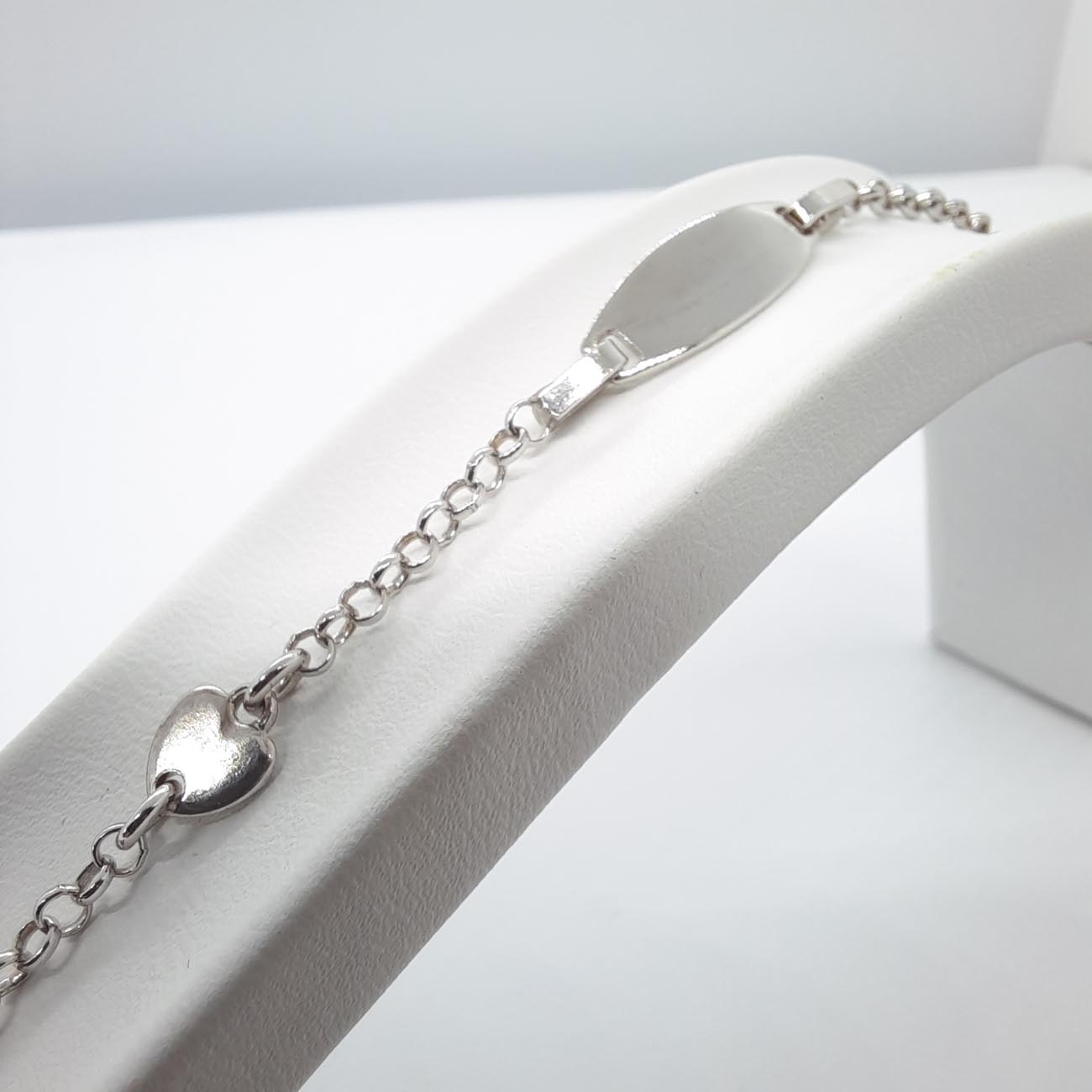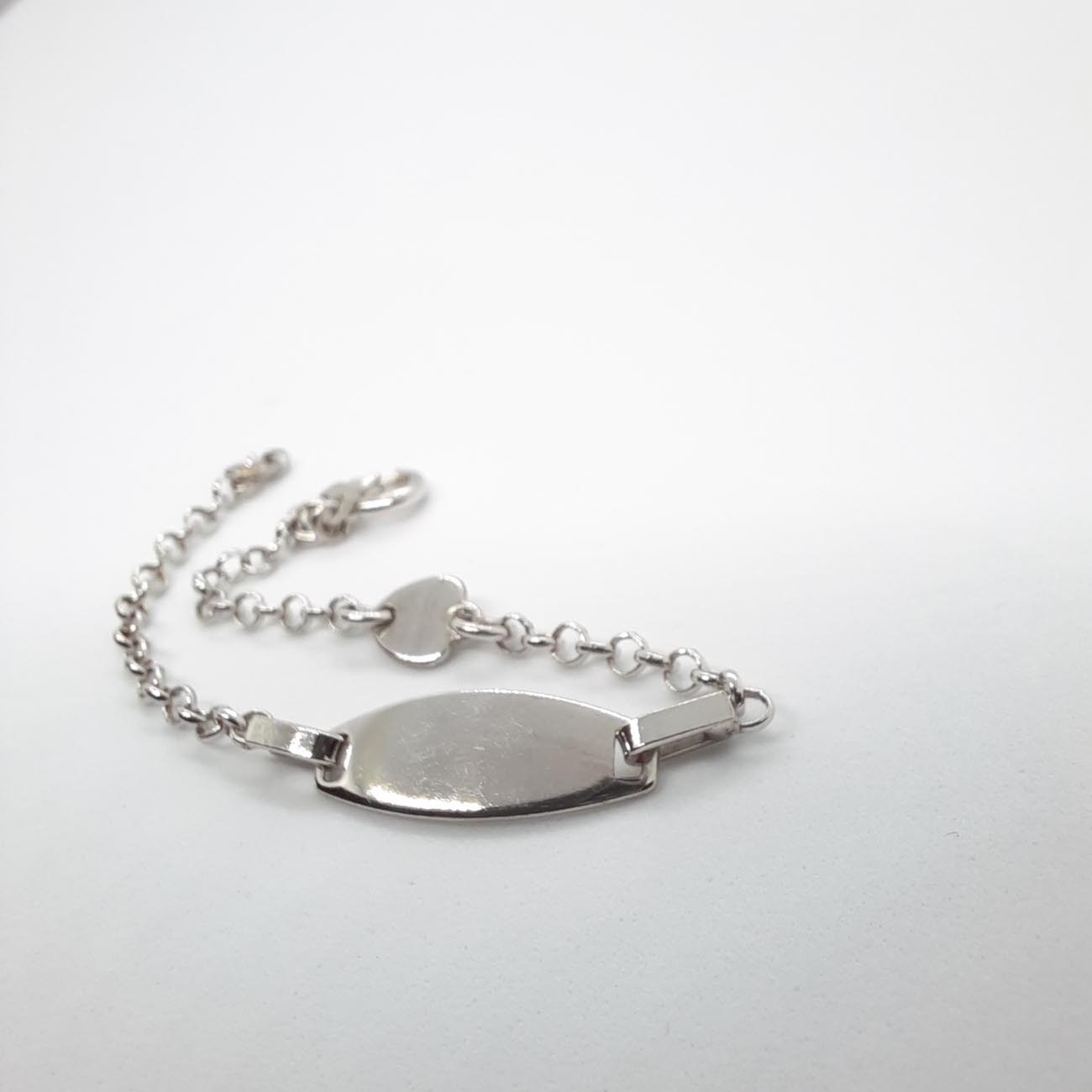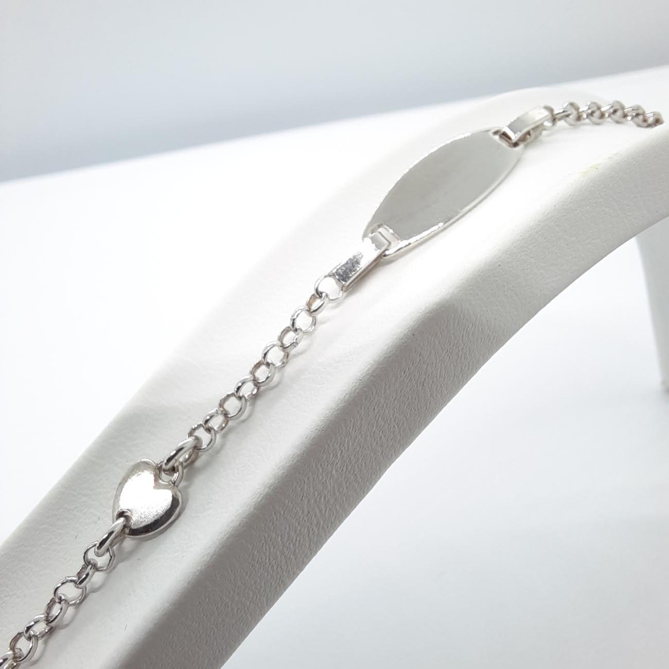 Λιτό και όμορφο design από ασήμι 9.25 με μικρή πλακέτα με δυνατότητα χάραξης ονόματος/μονογράμματος κατόπιν παραγγελίας και κρεμαστή καρδιά, ένα πολύτιμο δώρο για αγοράκι ή κοριτσάκι.