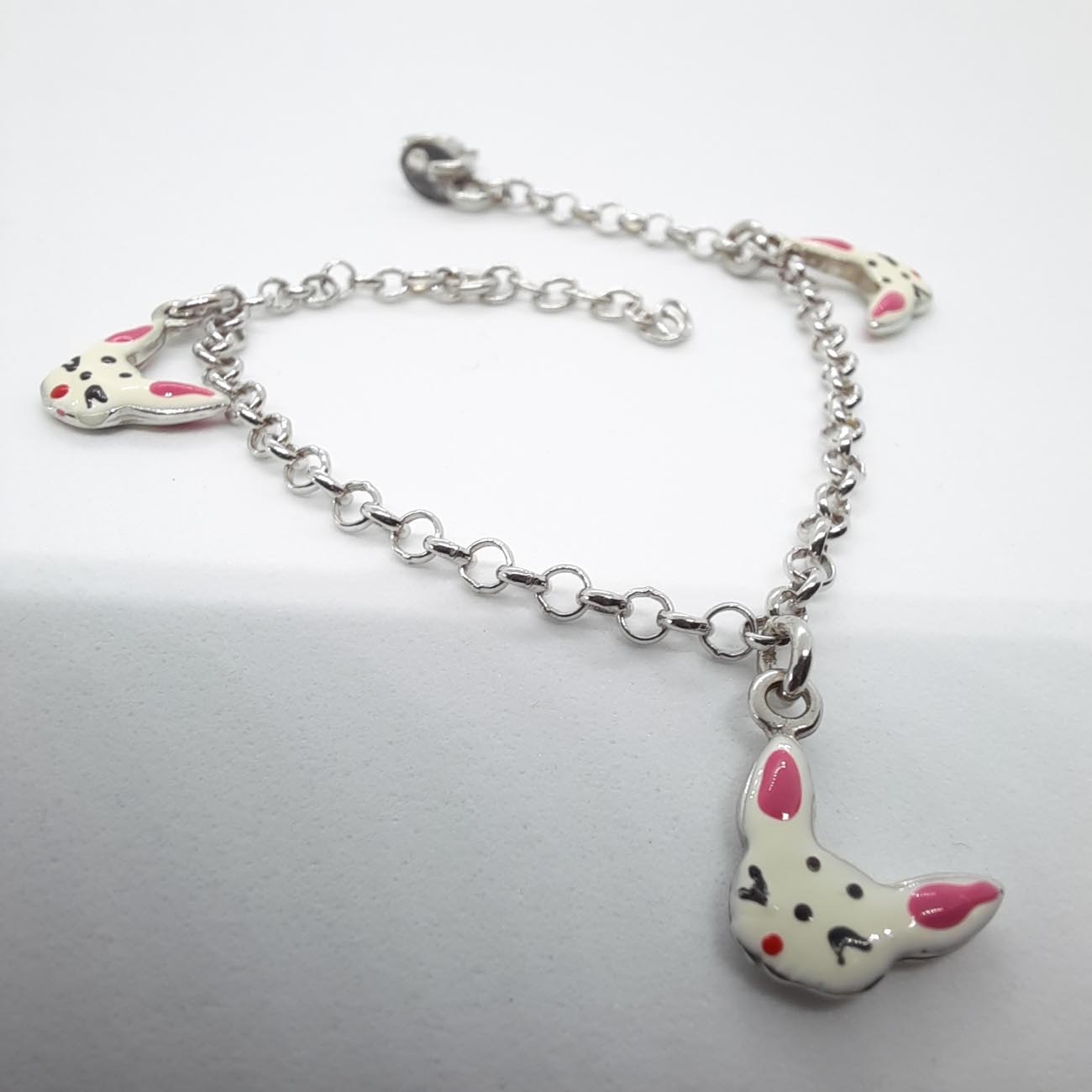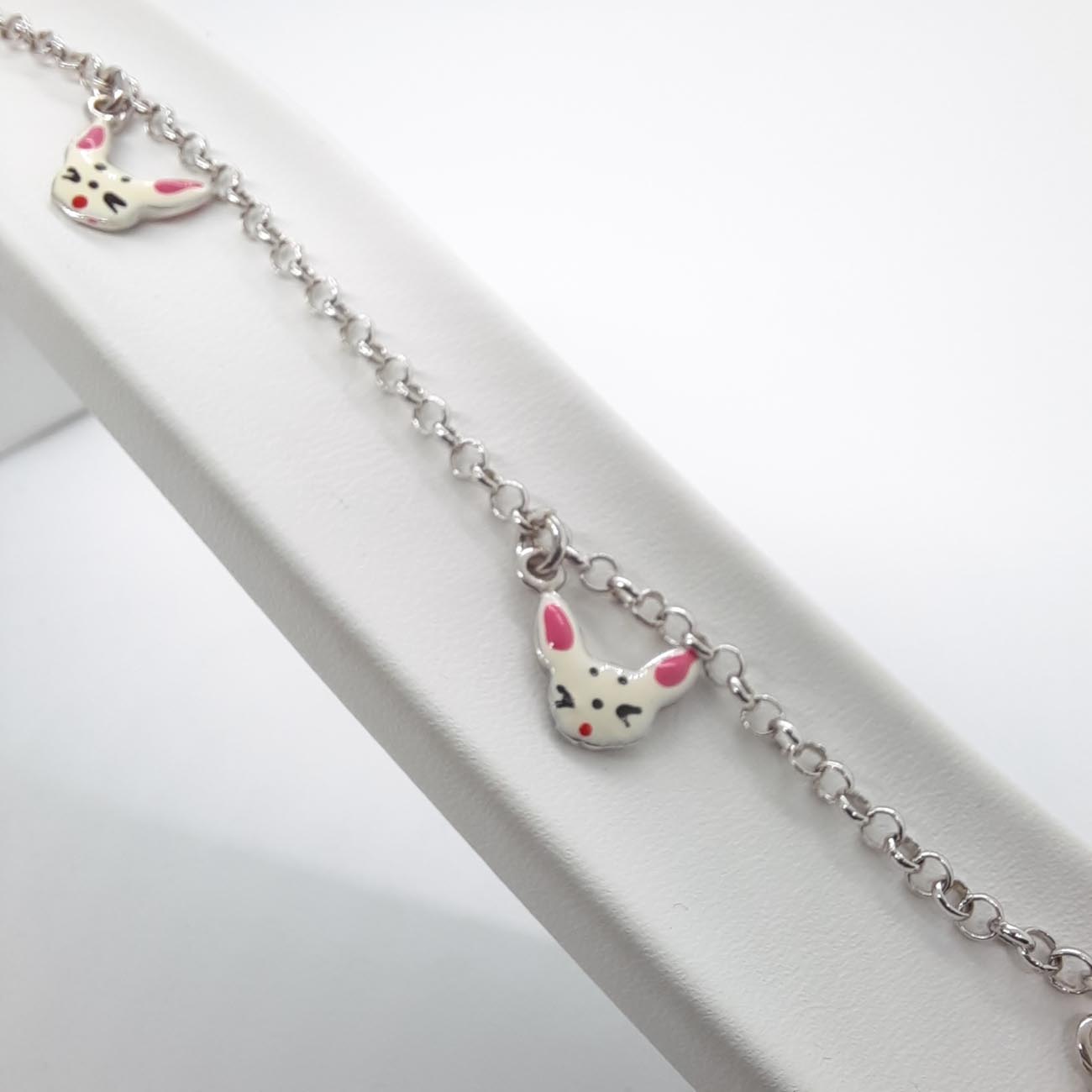 Ασημένιο παιδικό βραχιόλι 9.25 με μικρά χαριτωμένα πρόσωπα γάτας , με σμάλτο σε ροζ και άσπρο χρώμα.