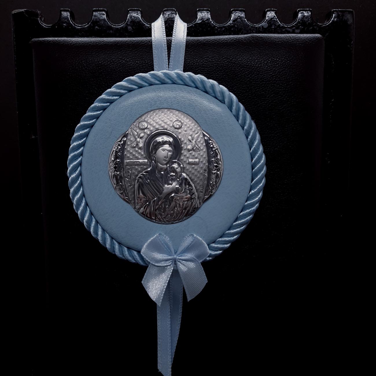 Ασημένια εικόνα για κούνια παιδική , σε στρογγυλό σχήμα, με Παναγία, πολύτιμο δώρο προστασίας για το νεογέννητο.