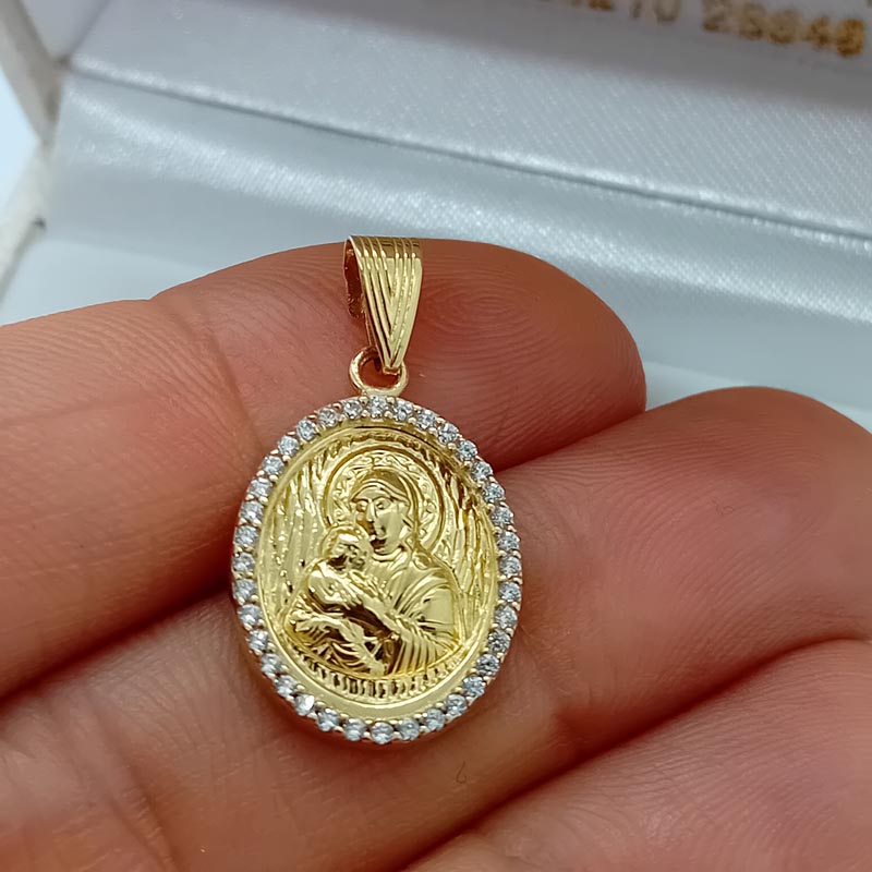Στολίζει περίτεχνα τον λαιμό κάθε γυναίκας , μενταγιόν με ανάγλυφες φιγούρες της Παναγίας με τον Χριστό στην αγκαλιά της, από χρυσό 9 καρατίων, σε οβάλ design, περιστοιχισμένο με λευκά διακριτικά ζιργκόν και κρικάκι με κομψή χάραξη.