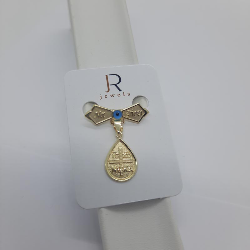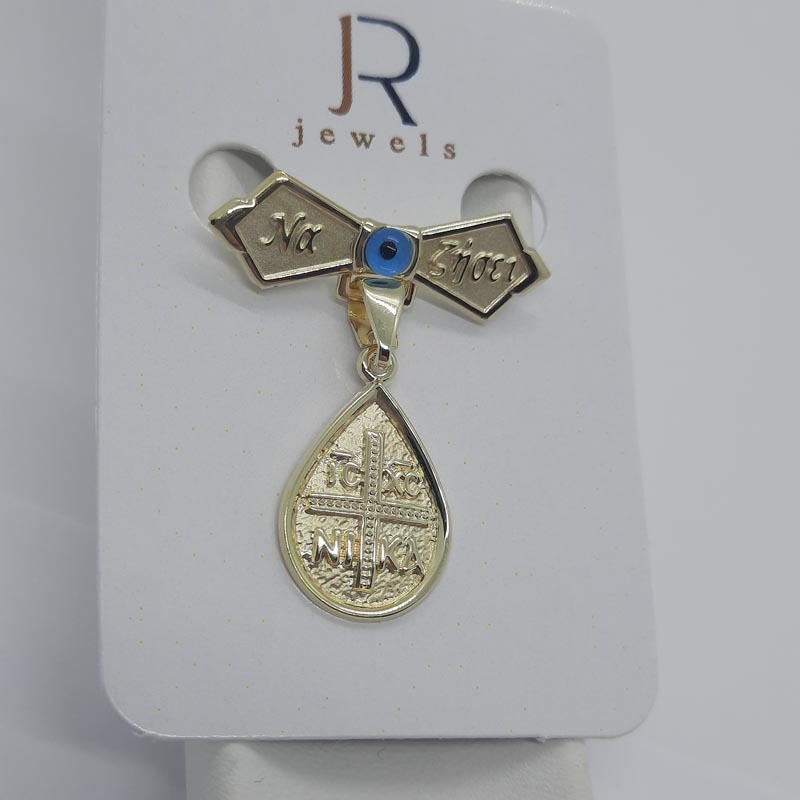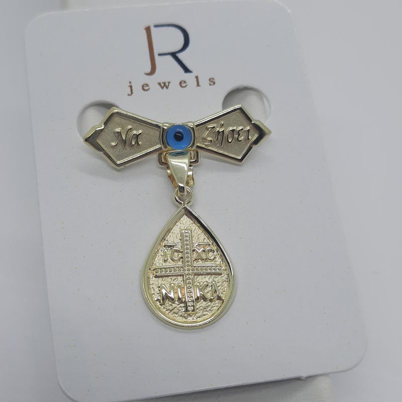 Φυλακτό για το μωράκι σας από χρυσό 9 καρατίων σε όμορφο οβάλ σχήμα με χαραγμένο σταυρό και τα σύμβολα ΙΗΣΟΥΣ ΧΡΙΣΤΟΣ ΝΙΚΑ και πλακέτα με ευχή "Να ζήσει" και στο κέντρο της γαλάζιο ματόχαντρο. Μπορείτε να αφαιρέσετε το μοτίφ και να το φορέσετε σαν μενταγιόν στον λαιμό σας εσείς ή μόλις μεγαλώσει η μπέμπα.