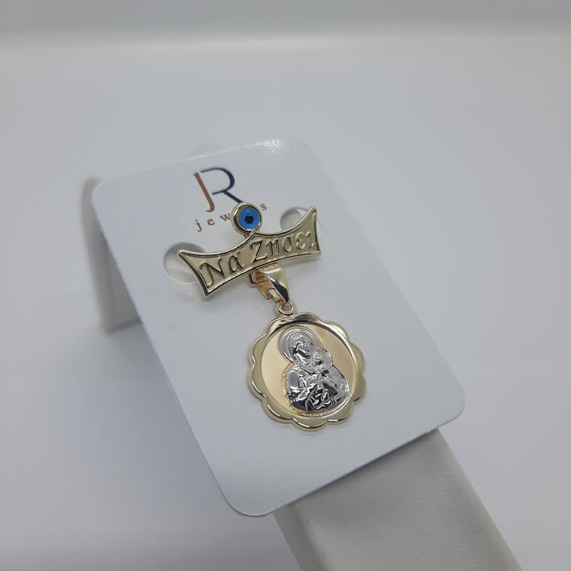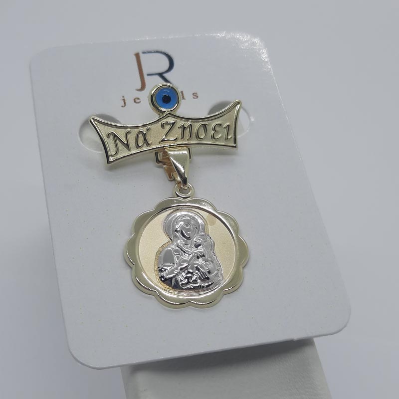 Υπέροχο χρυσό φυλακτό Κ9 Παναγίτσα σε κυκλικό δισκάκι ματ όψης σαν λουλούδι με πέταλα λουστρέ όψης, με πλακέτα ματ όψης που θυμίζει στέμα στην οποία υπάρχει ανάγλυφη λουστρέ ευχή "Να ζήσει", στην κορυφή του οποίου υπάρχει γαλάζιο ματόχαντρο. Η Παναγίτσα φοριέται και στον λαιμό ως μενταγιόν από την μαμά ή αργότερα και από την κόρη!