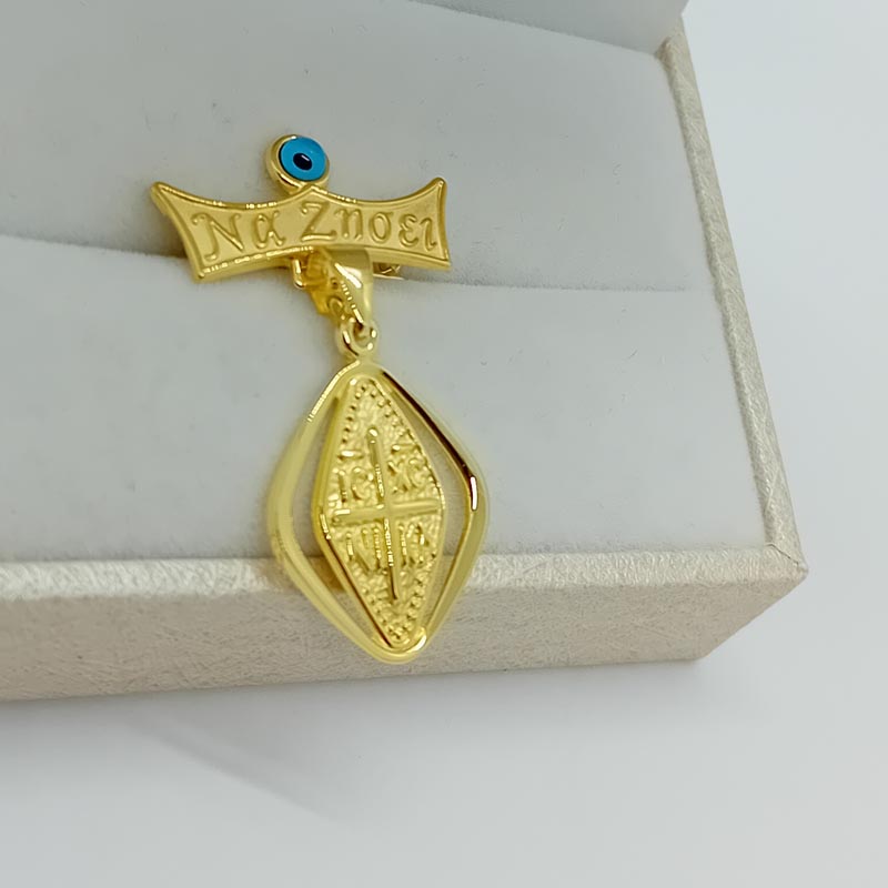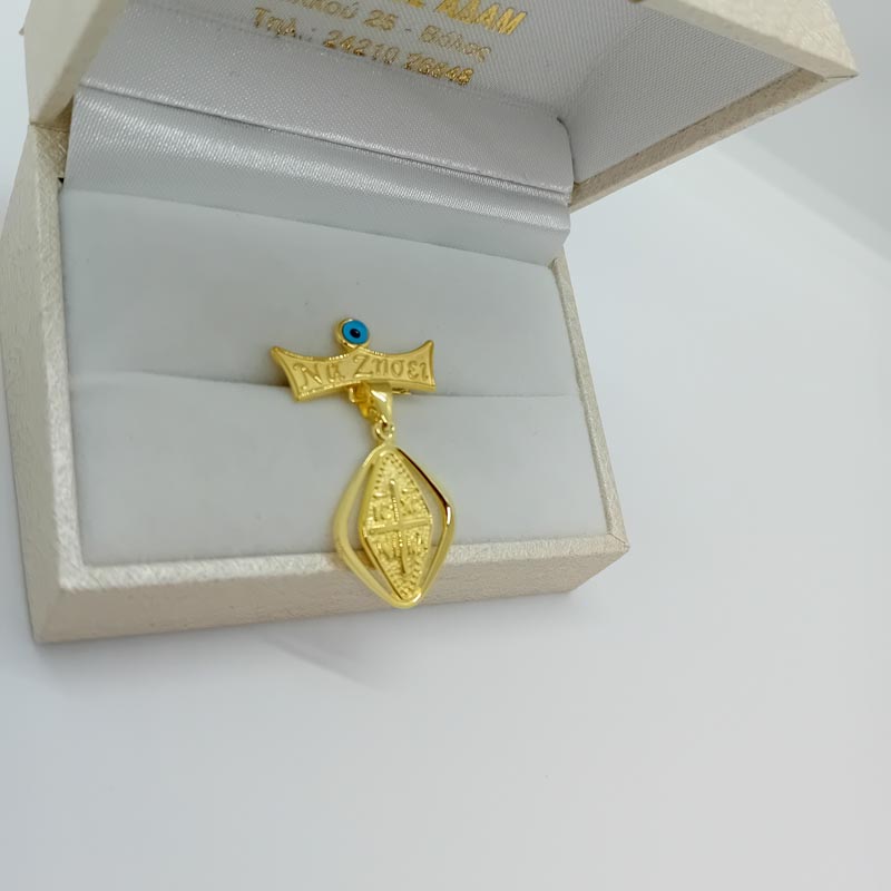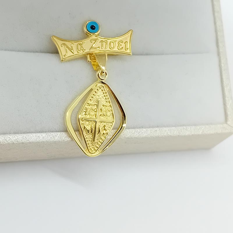 Για προστασία και ευλογία στο νεογέννητο, φυλακτό χρυσό Κ9, με μοντέρνο design ρόμβο και ανάγλυφο σταυρό με ΙΗΣΟΥΣ ΧΡΙΣΤΟΣ ΝΙΚΑ σκαλισμένο και πλακέτα στυλ κορώνας με ευχή "Να ζήσει" και μπλε χάντρα για το κακό μάτι.