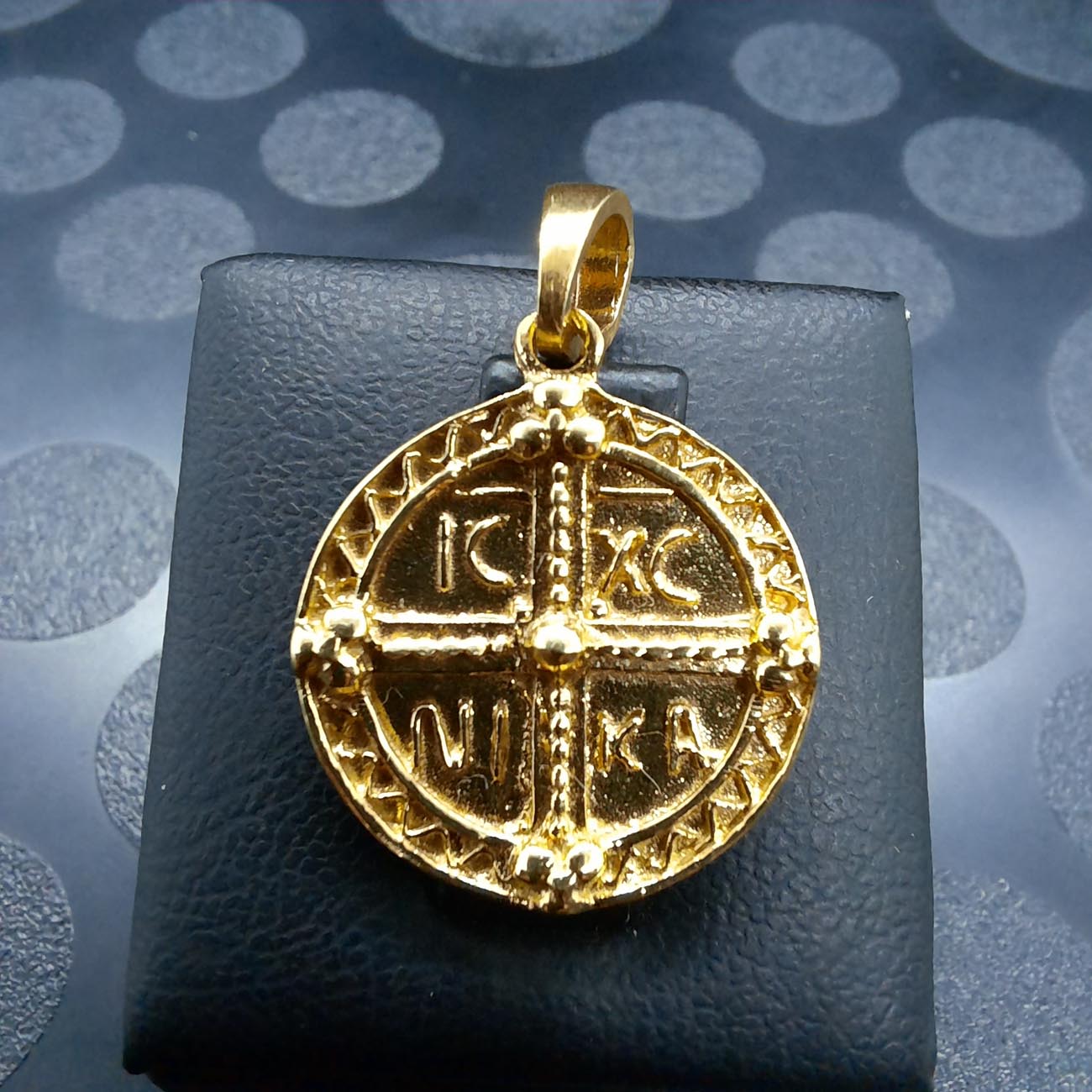 Ολόχρυσο φυλαχτό K14 για όσους αγαπάτε με επιγραφή ΙΗΣΟΥΣ ΧΡΙΣΤΟΣ ΝΙΚΑ, για ευλογία και προστασία από κακό μάτι και από ασθένεια. Πανέμορφο μοντέρνο και διαχρονικό μενταγιόν για τον λαιμό μας που μπορούμε άνετα να συνδυάσουμε με αλυσίδα ή δερμάτινο λουράκι.
