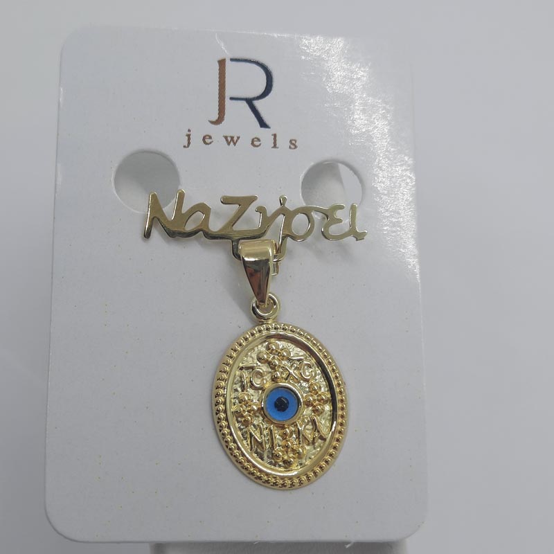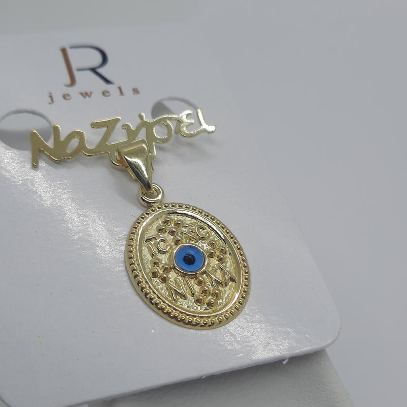 Χρυσό φυλακτό για το μωράκι σας με σκαλιστή ευχή "Να ζήσει" , κρεμαστό οβάλ με μπλε ματάκι στο κέντρο, 9 καράτια, ένα πραγματικά πολύτιμο δώρο ευλογίας και παράλληλα διαχρονικά εντυπωσιακό μενταγιόν, καθώς μόλις μεγαλώσει η μικρή θα αφαιρέσει την ευχή και να φορέσει το μενταγιόν στον λαιμό της.