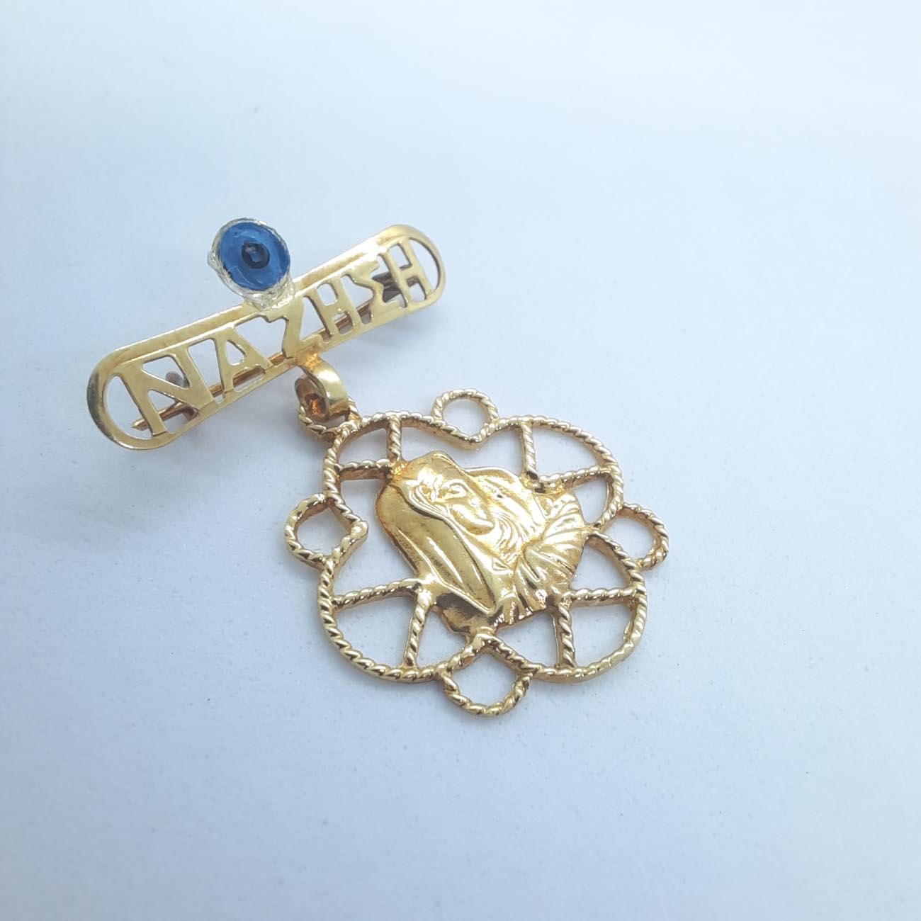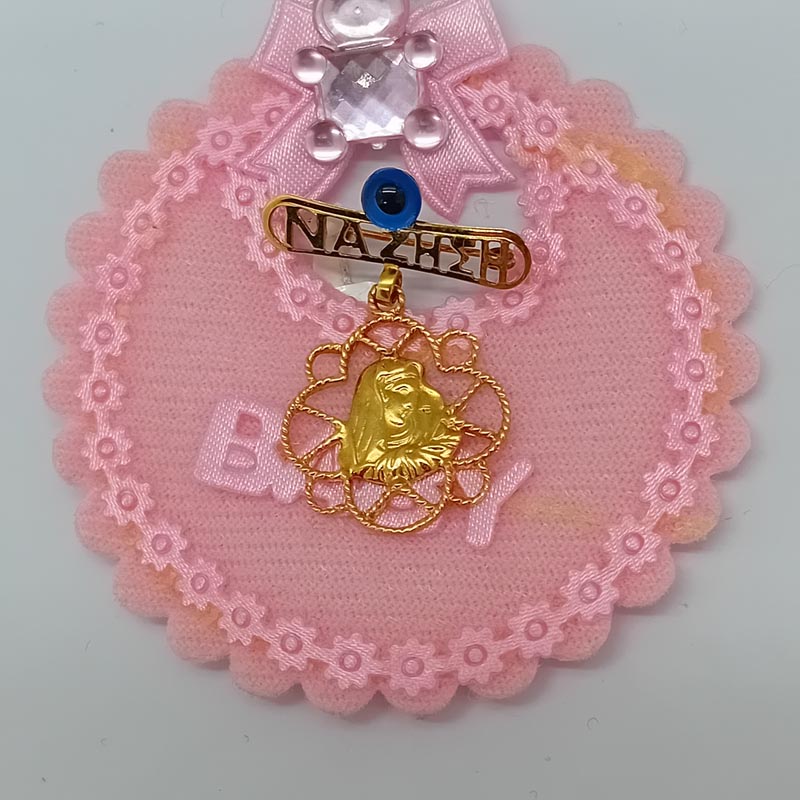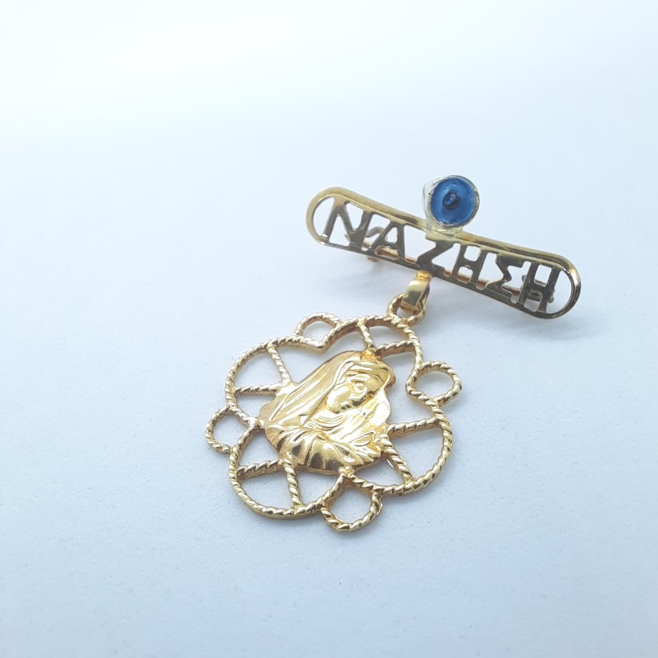 Ευλαβικό δώρο για προστασία του νεογέννητου , ένα χρυσό φυλαχτό με πανέμορφη σκαλιστή Παναγία, 14 καρατίων, με ματάκι και ευχή.