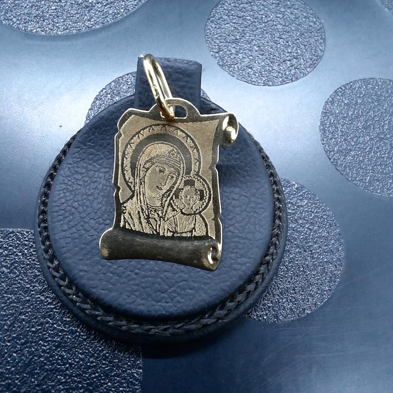 Χρυσή Παναγία με το Θείο Βρέφος,K14 σε σχήμα πάπυρου, ιδανικό φυλαχτό για την κούνια του νεογέννητου , προστασία από κάθε βασκανία και ασθένεια. Πανέμορφο μοντέρνο και διαχρονικό μενταγιόν για τον λαιμό μας που μπορούμε άνετα να συνδυάσουμε με αλυσίδα ή δερμάτινο λουράκι.
