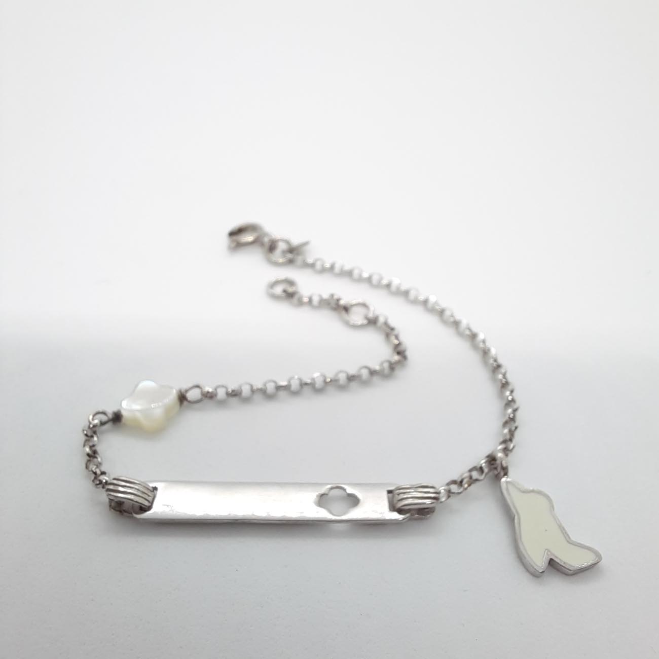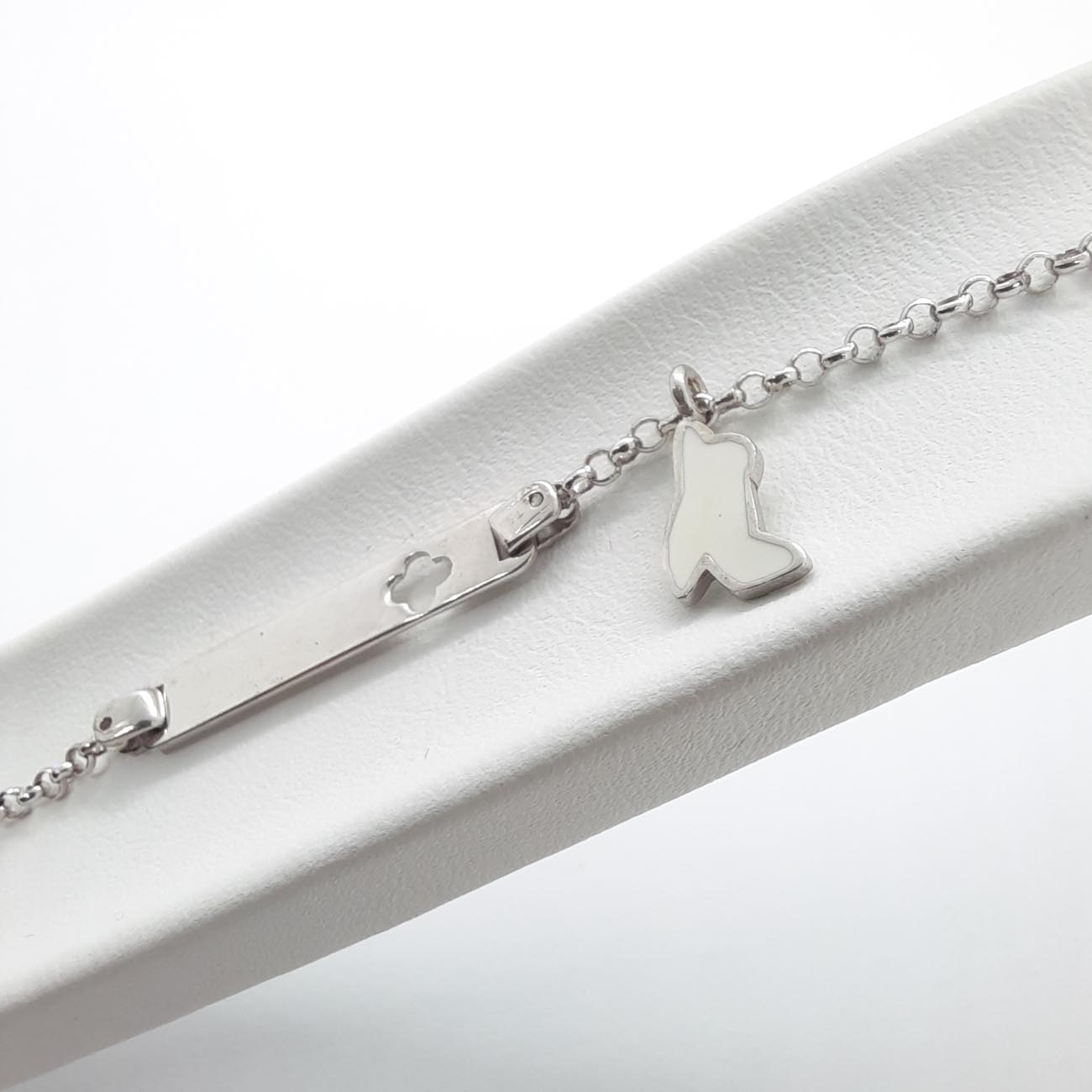 Υπέροχη ταυτότητα από ασήμι 9.25 με πλακέτα με δυνατότητα χάραξης ονόματος/μονογράμματος , με σταυρό από λευκό φίλντισι και ασημένια μπότα από λευκό σμάλτο, ιδανικό κόσμημα για μια κομψή δεσποινίδα.