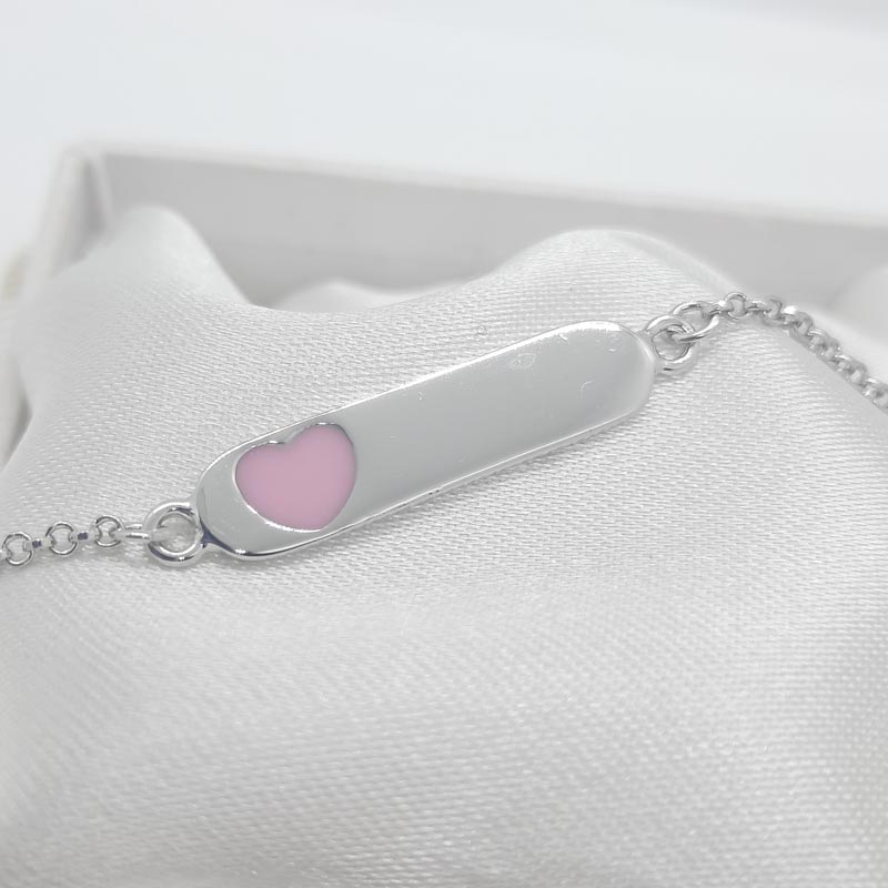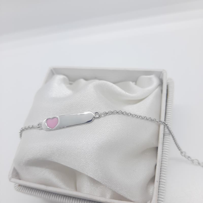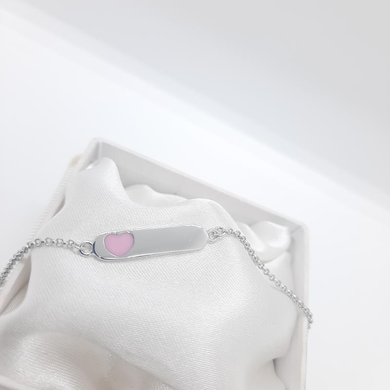 Για κοριτσάκι από ασήμι 9.25 πανέμορφη ταυτότητα με ροζ καρδιά από σμάλτο. Επικοινωνήστε με το κατάστημά μας για δωρεάν χάραξη μονογράμματος ή ονόματος