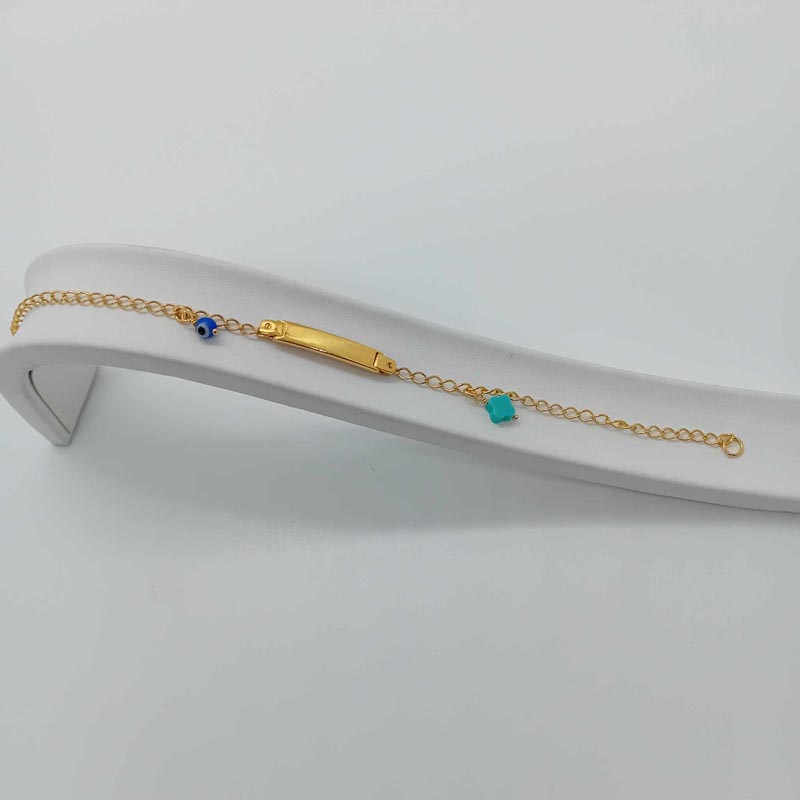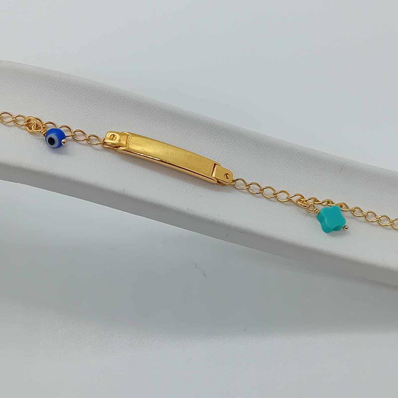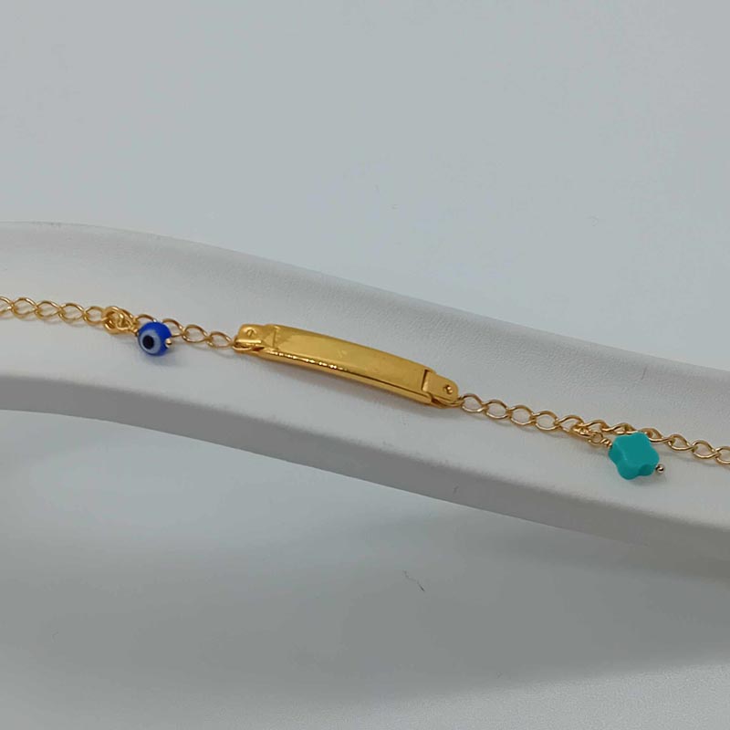 Ταυτότητα παιδική unisex, από επιχρυσωμένο ασήμι, με κρεμαστό τυρκουάζ σταυρουδάκι και μπλε ματόχαντρο, με δυνατότητα χάραξης ονόματος στην πλακέτα κατόπιν παραγγελίας και συννενοήσεως με το κατάστημά μας.