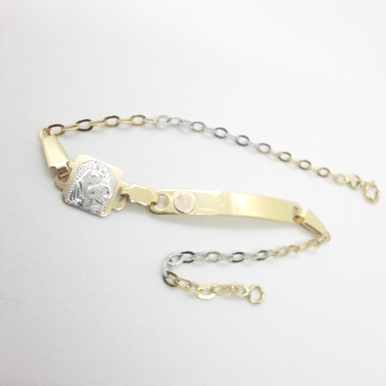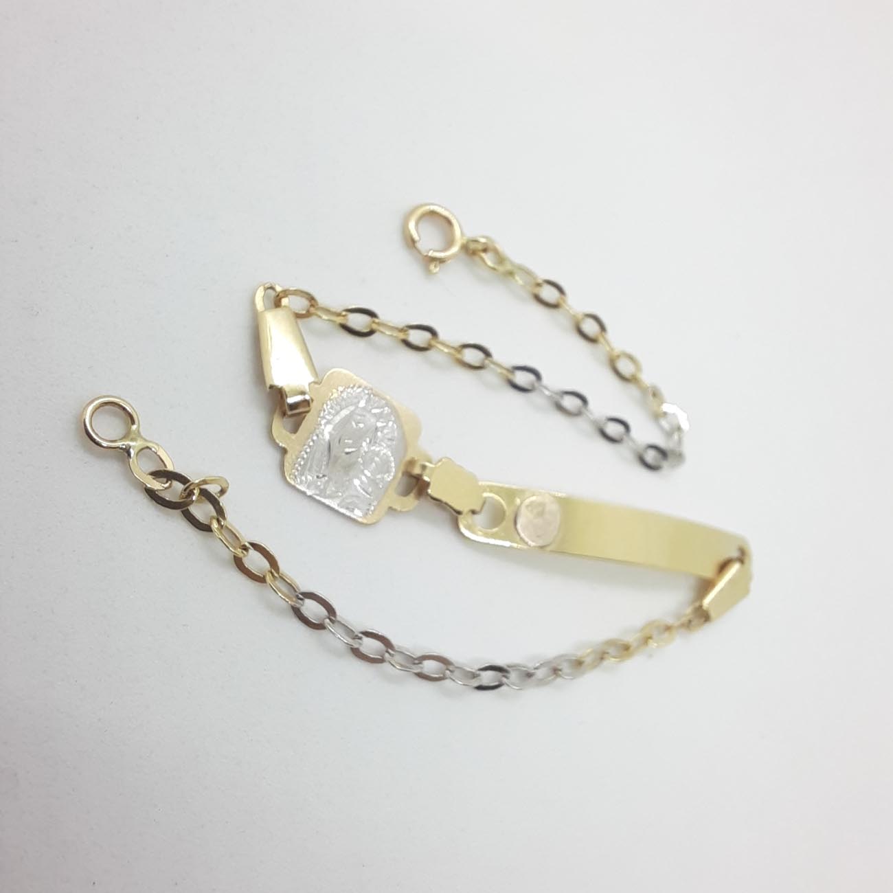 Χρυσή ταυτότητα 14 καρατίων, με εικόνα Παναγίας με Χριστό στην αγκαλιά της unisex design με όμορφη φαρδιά πλακέτα για χάραξη (δωρεάν) του ονόματος που επιθυμείτε.