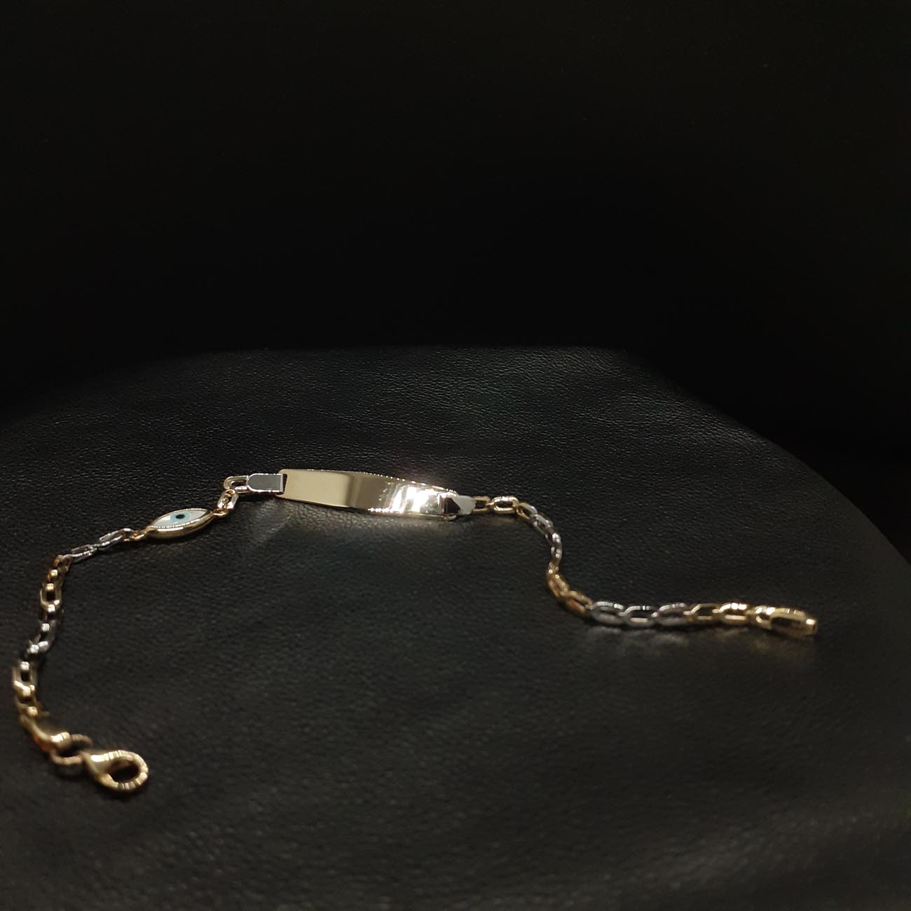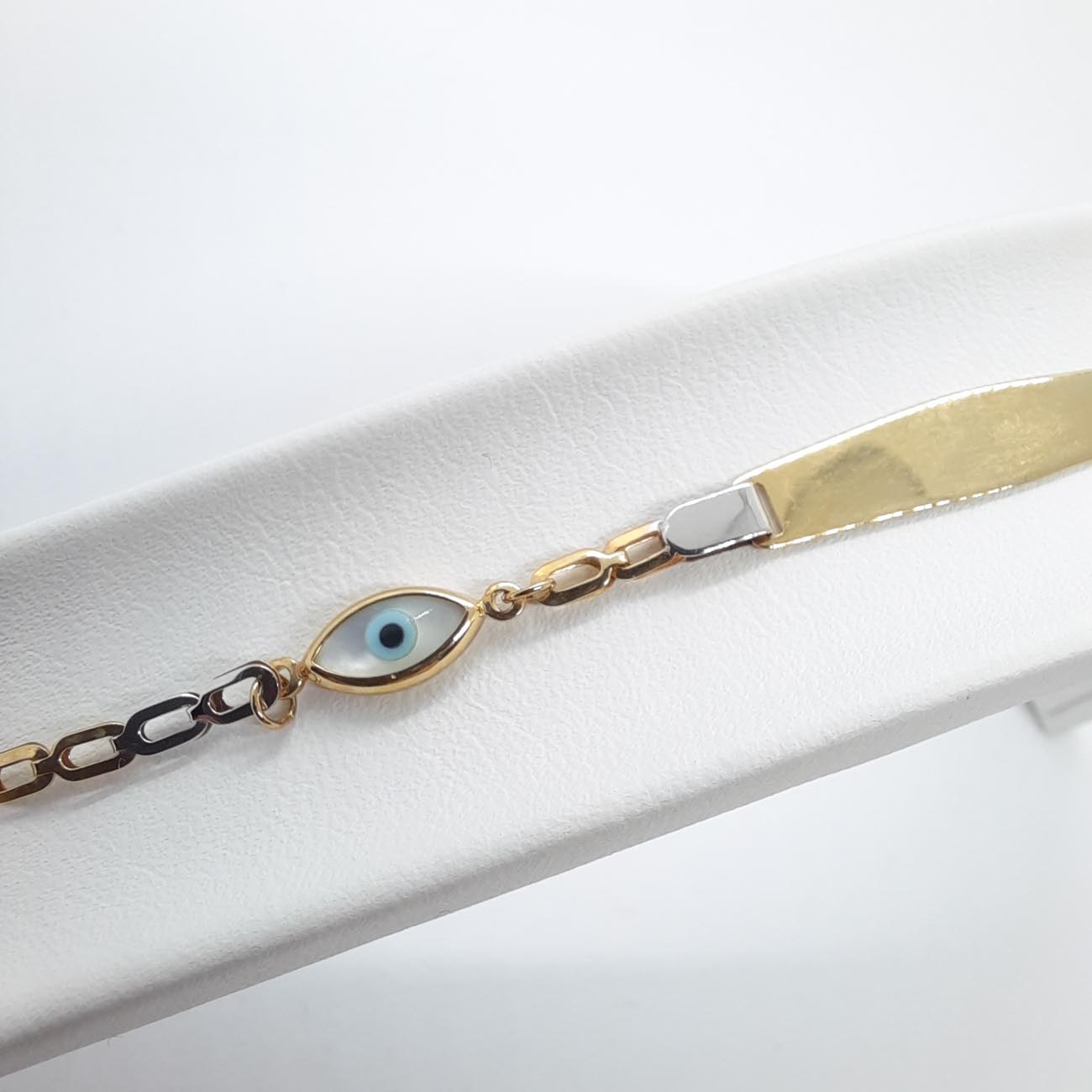 Χρυσή ταυτότητα 14 καρατίων με υπέροχο ματάκι και αλυσίδα με λευκόχρυσους και χρυσούς κρίκους, ένα πραγματικό δώρο αγάπης προς το νεογέννητο αγοράκι και κοριτσάκι.