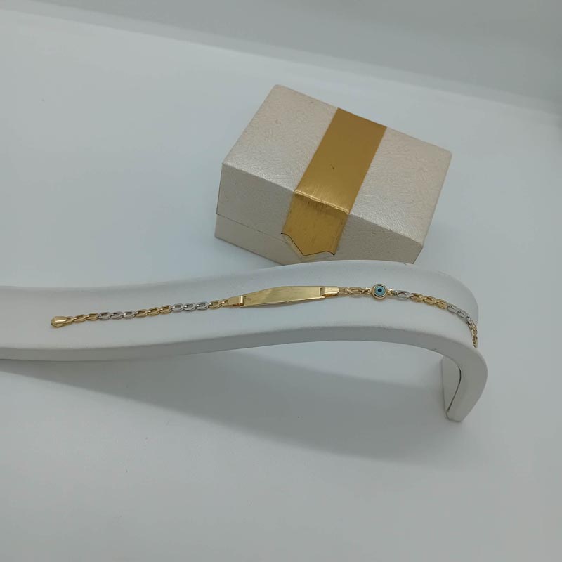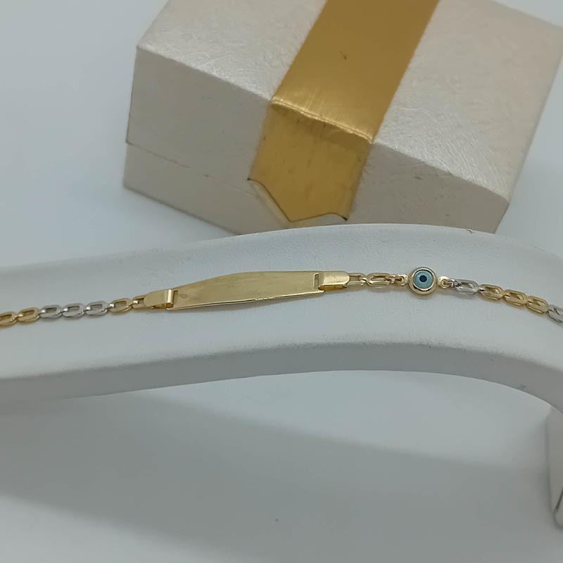 Χρυσή ταυτότητα unisex, 9 καρατίων, με ωραία δίχρωμη αλυσίδα, με μικρό ματόχαντρο και φαρδιά πλακέτα για χάραξη του ονόματος που επιθυμείτε.