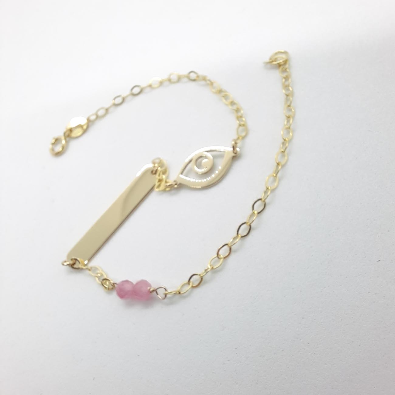 Με δύο ροζ μικρές χάντρες και μοντέρνου design μάτι αυτή η χρυσή ταυτότητα σίγουρα θα ξετρελάνει τις μικρές μας!