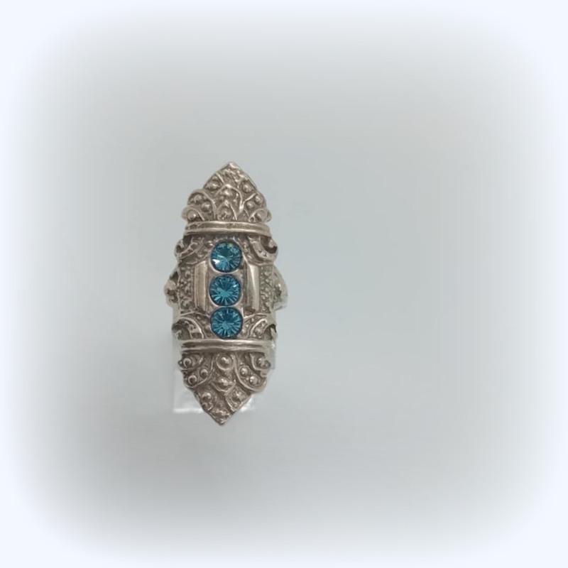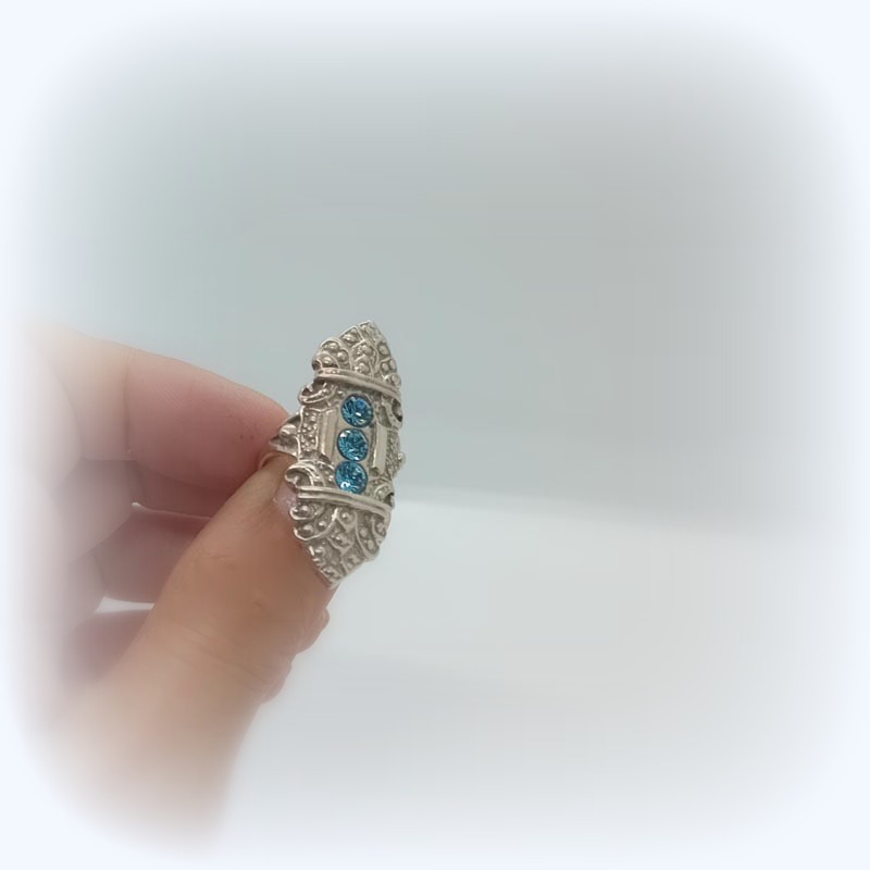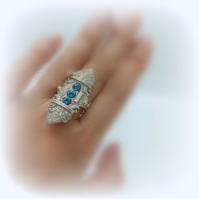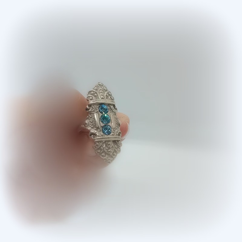 Με 3 αστραφτερά γαλάζια ζιργκόν και λεπτομερές σκάλισμα, αυτό το ασημένιο δαχτυλίδι , από ασήμι 925 ματ όψη και μεγάλη εντυπωσιακή εμφάνιση, είναι ιδανικό για μποέμ εμφανίσεις, κυρίως καλοκαιρινές !