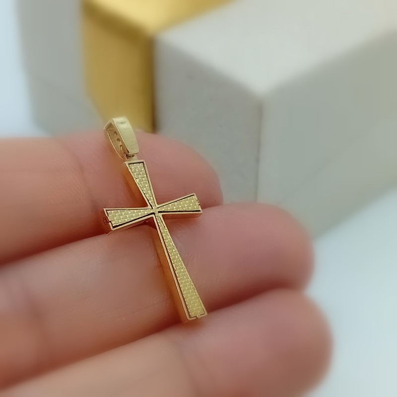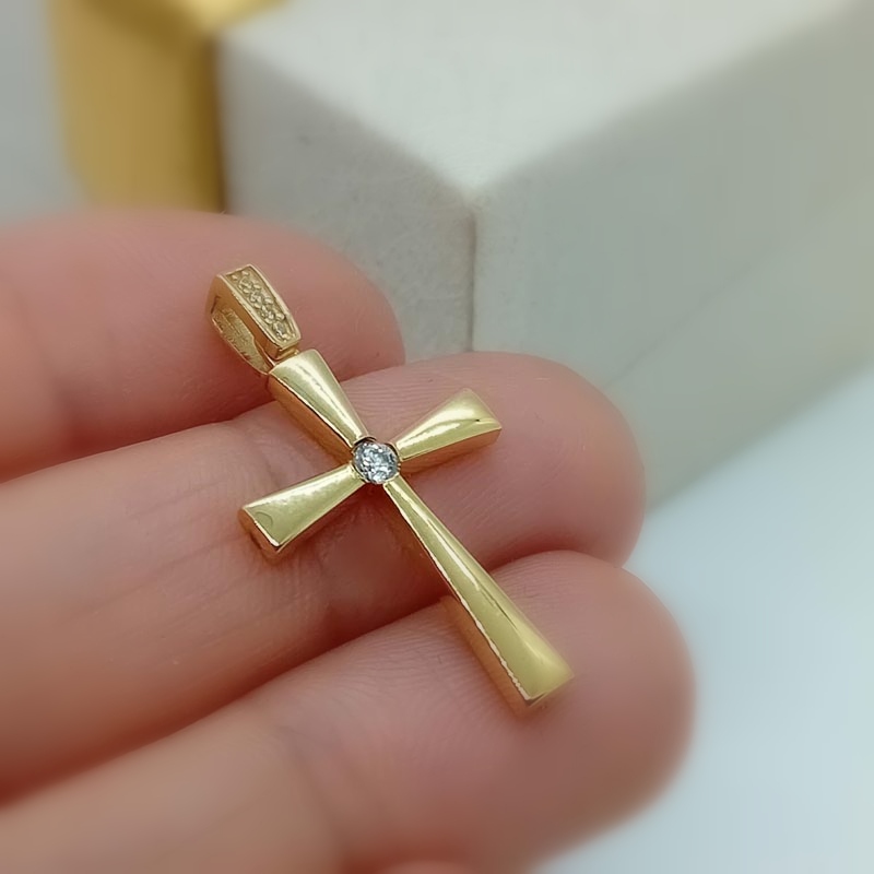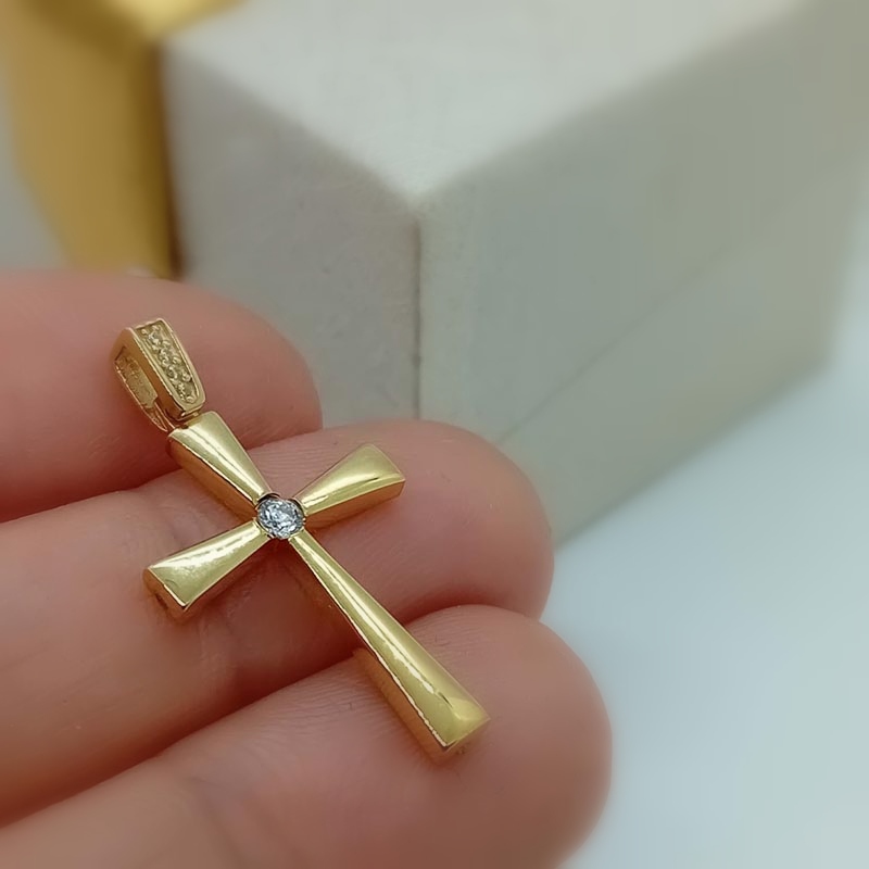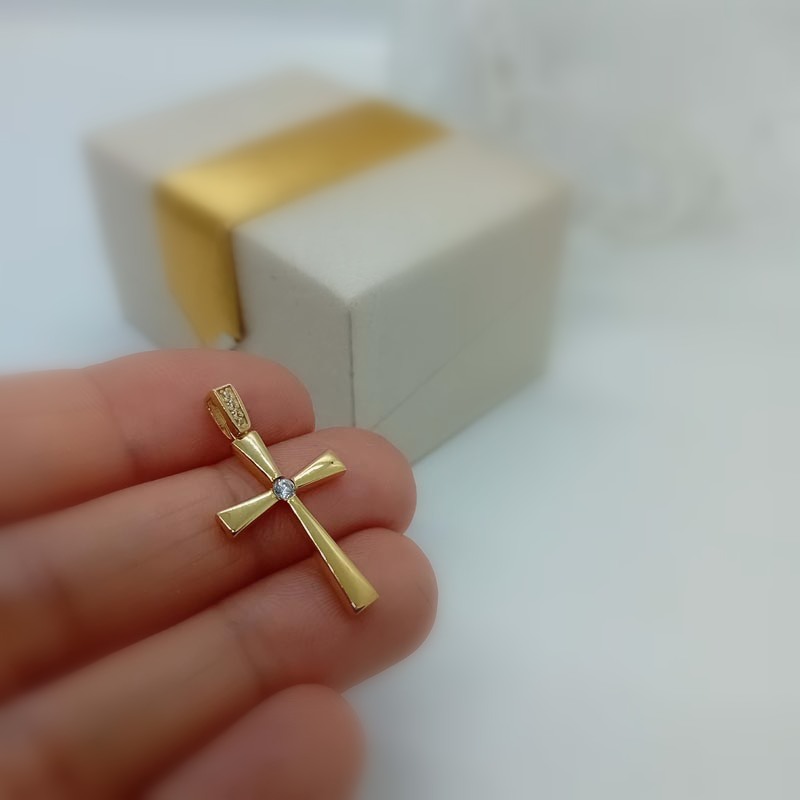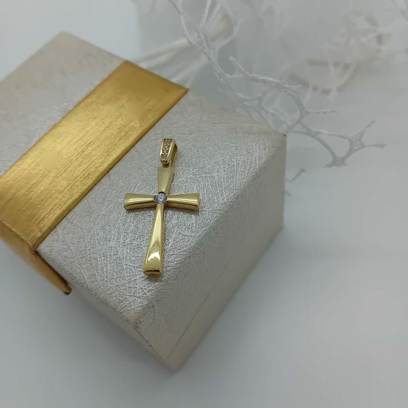 Λεπτεπίλεπτος και ντελικάτος Ορθόδοξος σταυρός γυναικείος, με λουστρέ επιφάνεια, ένα κεντρικό ζιργκόν και πολλά μικρότερα ζιργκόν στον πραγματικά υπέροχο κρίκο του, φοριέται άνετα και ντουμπλ-φας, 9 καρατίων.