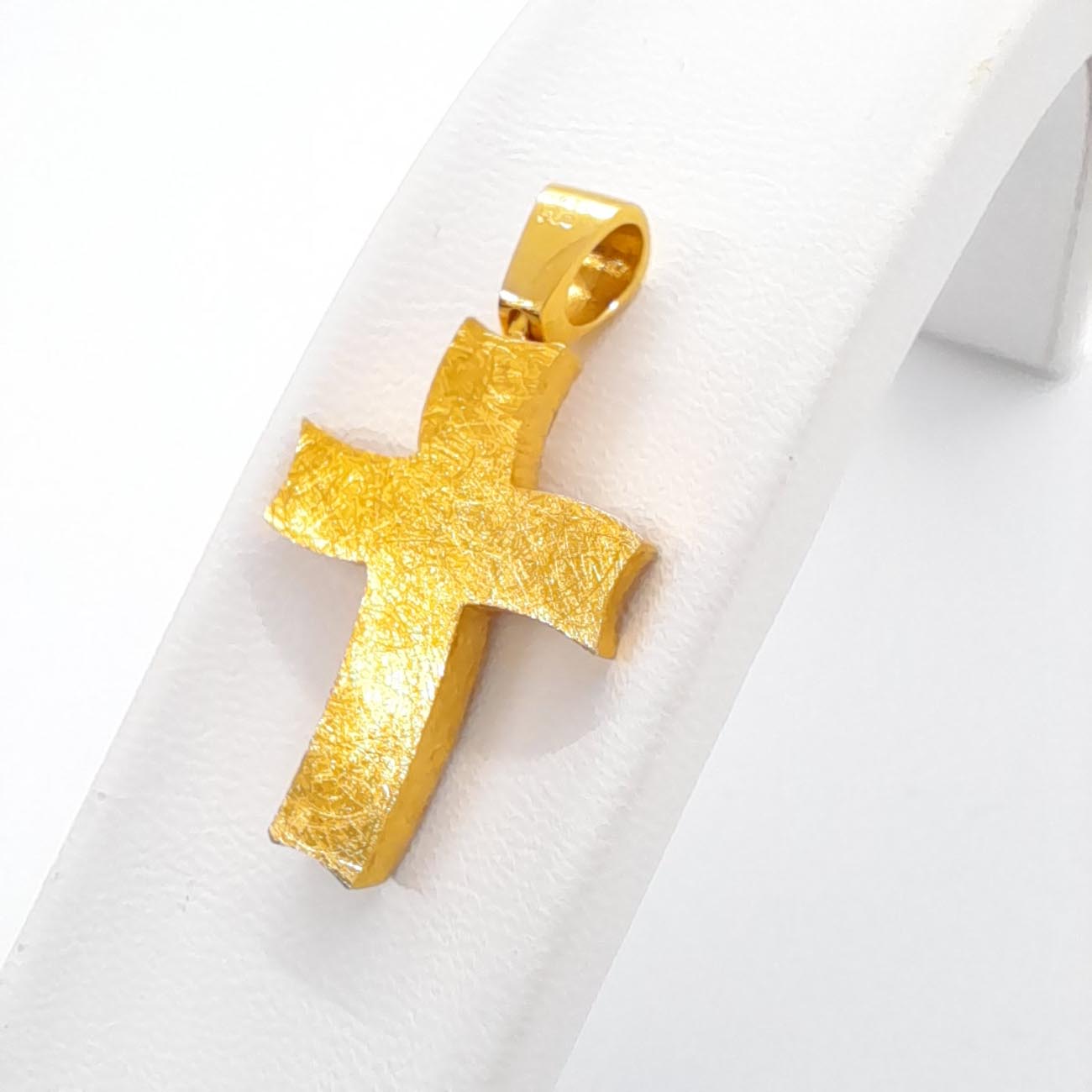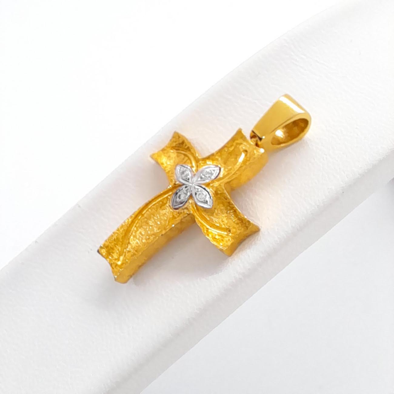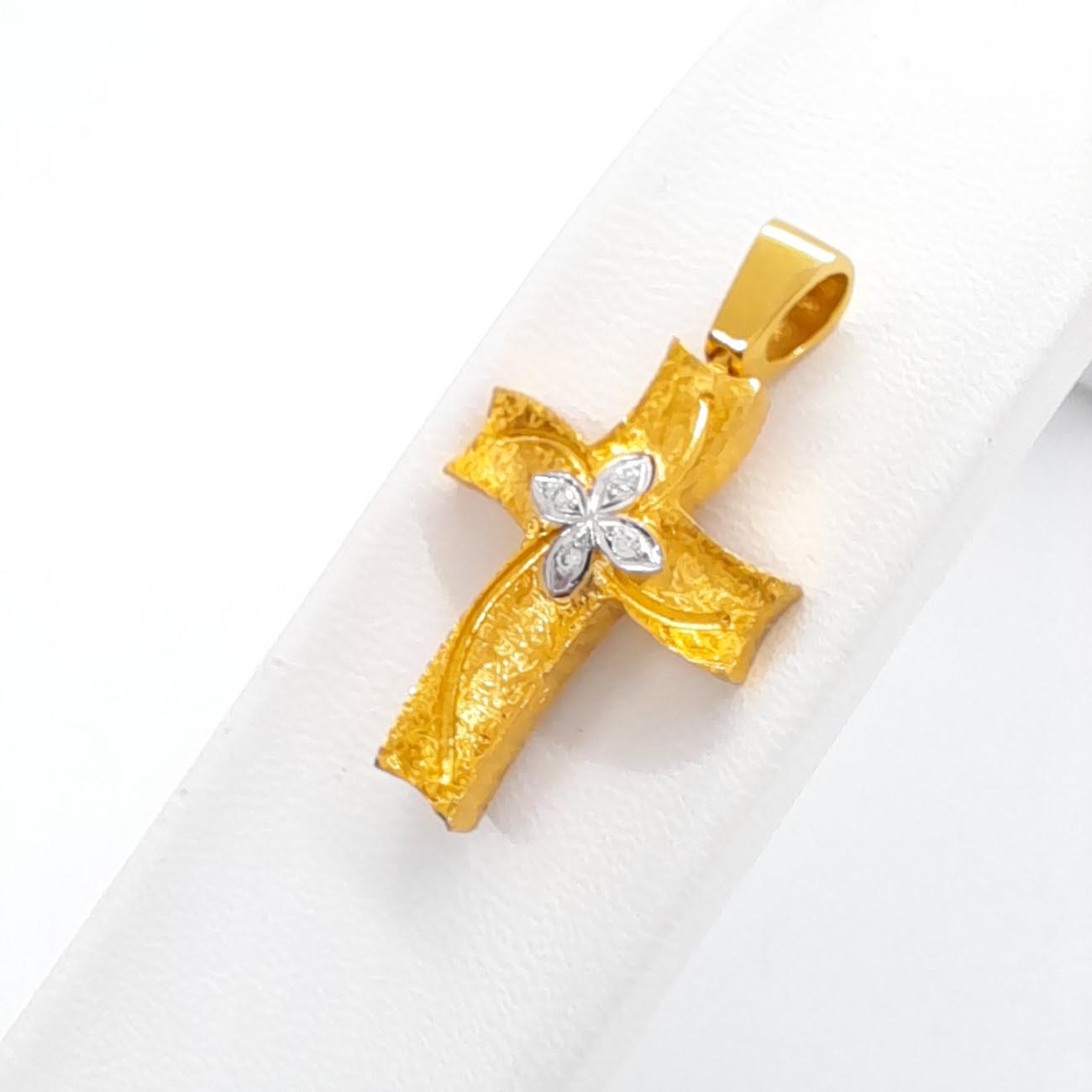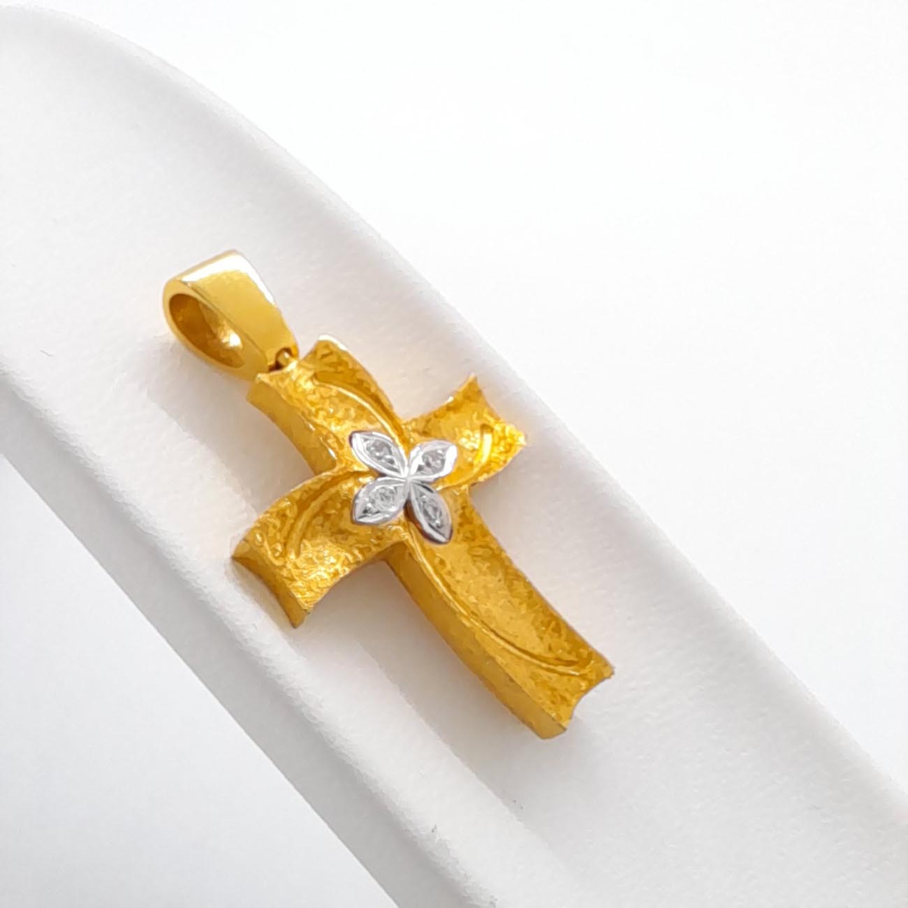 Υπέροχος γυναικείος σταυρός από χρυσό 14 καρατίων, ιδιαίτερο design, ελαφρώς καμπυλωτές άκρες, ζαγρέ σκαλιστή επιφάνεια , μικρό σταυρό από διακριτικά λευκά ζιργκόν στο κέντρο, λουστρέ φαρδύ κρίκο και όμορφη λιτή πίσω όψη ώστε να μπορεί να φορεθεί και ντούμπλ-φας.