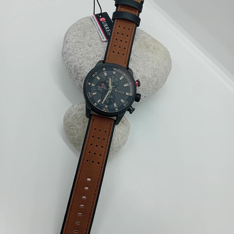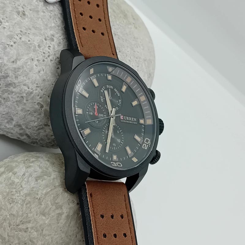 Για δυναμικό λούκ προτείνουμε αυτό το ανδρικό ρολόι της εταιρείας CURREN, με μαύρο καντράν και καφέ λουράκι, με ένδειξη ημέρας, με quartz . (48 mm διάμετρος)