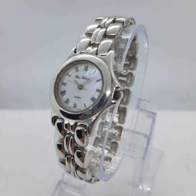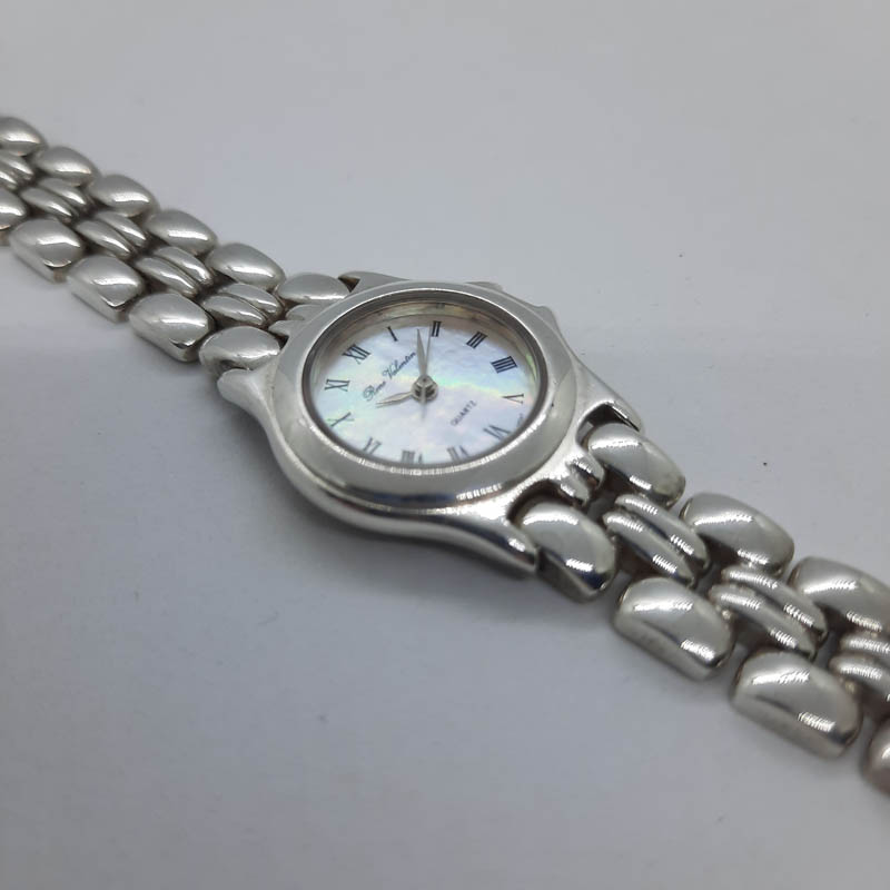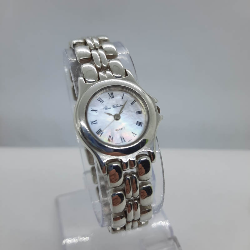 Πανέμορφο vintage ρολόι από αυθεντικό μασίφ ΑΣΗΜΙ (κάσωμα και μπρασελέ). Πολύ θηλυκό design, σαν κόσμημα, για λάτρεις και συλλέκτες του είδους,με μπρασελέ που αφαιρεί κομμάτια για να προσαρμοστεί στο χέρι σας,  με στρογγυλό καντράν από φίλντισι, με μηχανισμό quartz (προέλευση JAPAN), κούμπωμα ασφαλείας, μάρκα RENE VALENTIN.