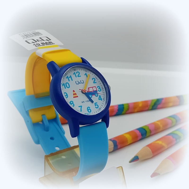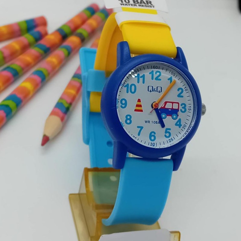 Μοντέρνο ρολόι για αγοράκι, αδιάβροχο για θάλασσα στα 100 μέτρα, μπαταρίας, βιδωτό καπάκι, με λουράκι σιλικόνης σε μπλε και κίτρινο χρώμα, με αυτοκινητάκι μέσα στο λευκό καντράν, της εταιρείας Q&Q .