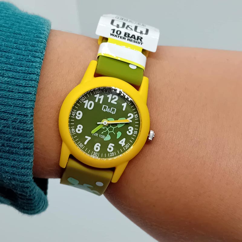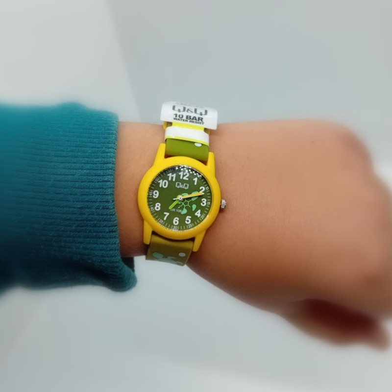 Για αγοράκι ή κοριτσάκι ρολόι της εταιρείας Q-&-Q , αδιάβροχο στα 10 bar , από καλής ποιότητας υλικό, με λουράκι σε αποχρώσεις λαδοπράσινες και κίτρινο καστόνι, με χαριτωμένα χελωνάκια στο λουράκι και στο καντράν και με πολύ καθαρούς άσπρους αριθμούς ώστε να μαθαίνουν την ώρα σωστά.