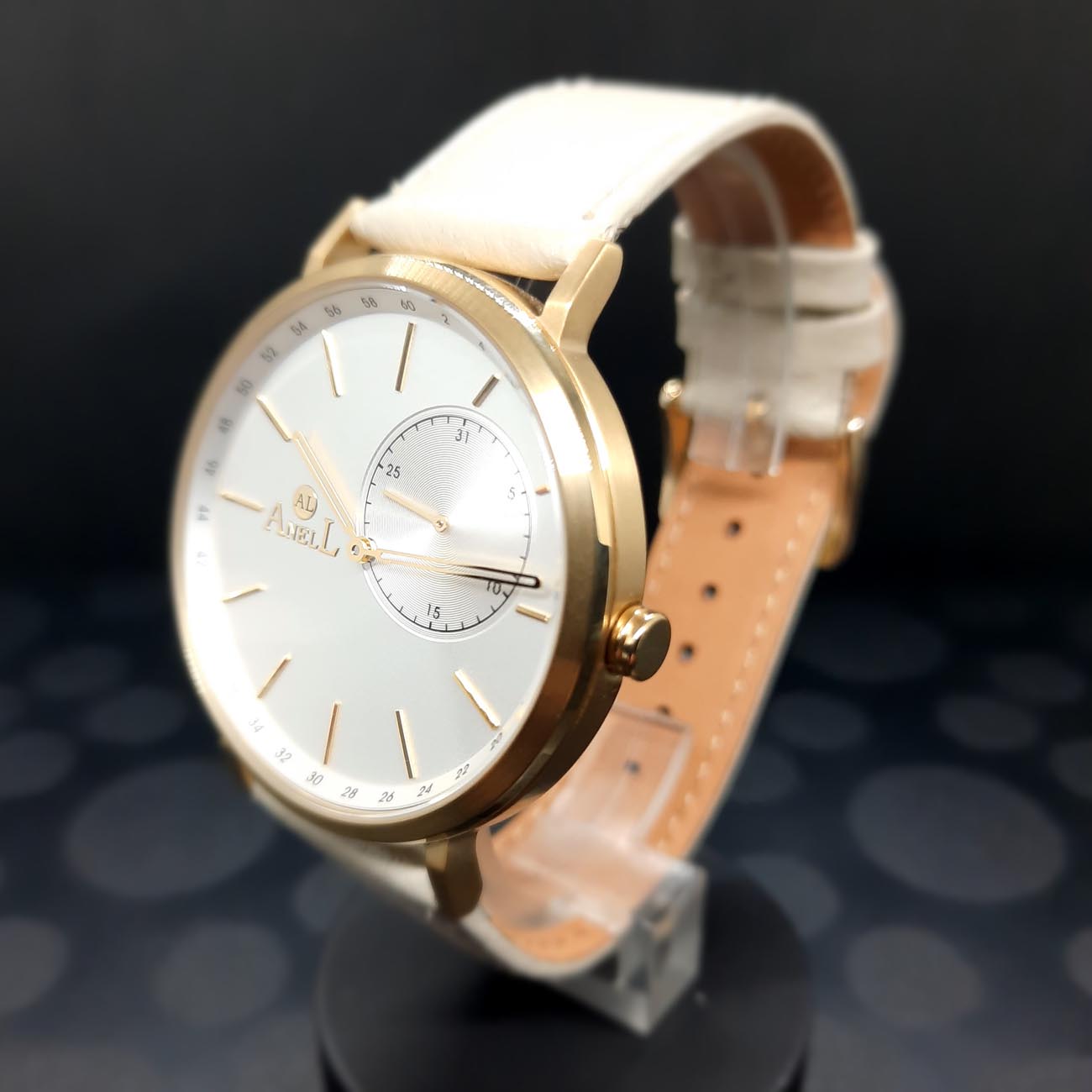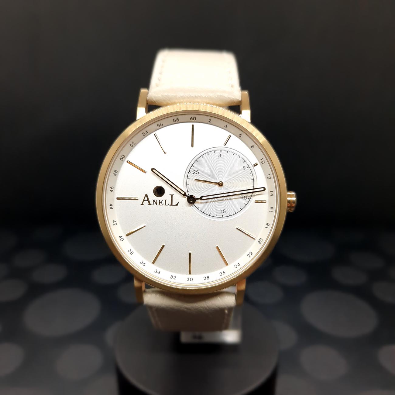 ΡΟΛΟΙ ANELL ατσάλινο με λουράκι δερμάτινο σε χρυσό ματ χρώμα με δευτρόλεπτο στο 2, αδιάβροχο στις 3 ατμ., με ένα χρόνο γραπτή εγγύηση.