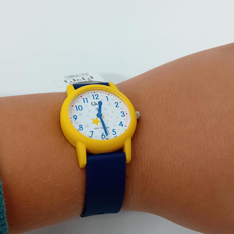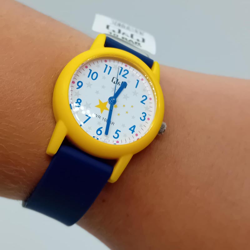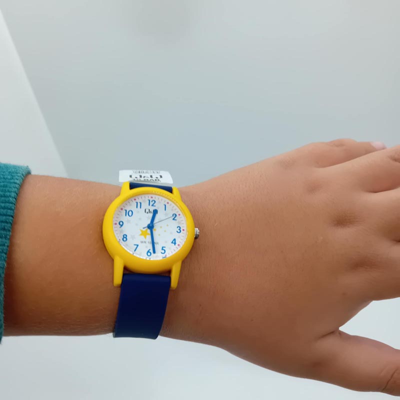 Για αγοράκι όμορφο σοβαρό ρολόι της εταιρείας Q-&-Q , αδιάβροχο στα 10 bar , από καλής ποιότητας καουτσούκ σκούρο μπλε λουράκι και λευκό καντράν με έντονα μπλε δείκτες και πολύ καθαρούς αριθμούς ώστε να μαθαίνει την ώρα σωστά Στο καντράν υπάρχουν με αστεράκια και το καστόνι είναι κίτρινο