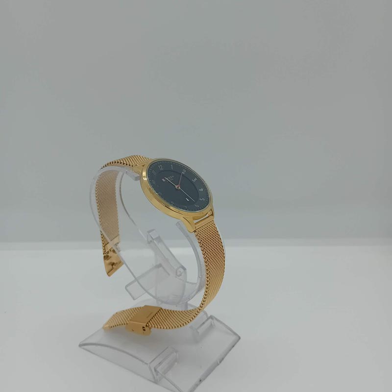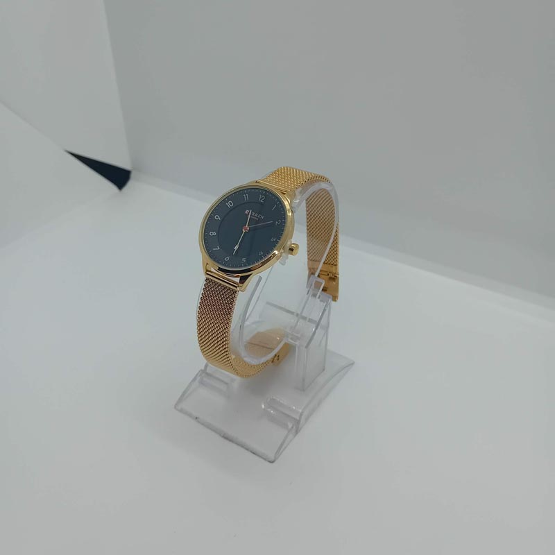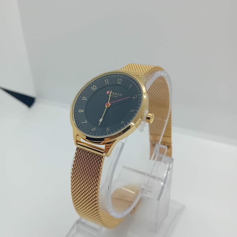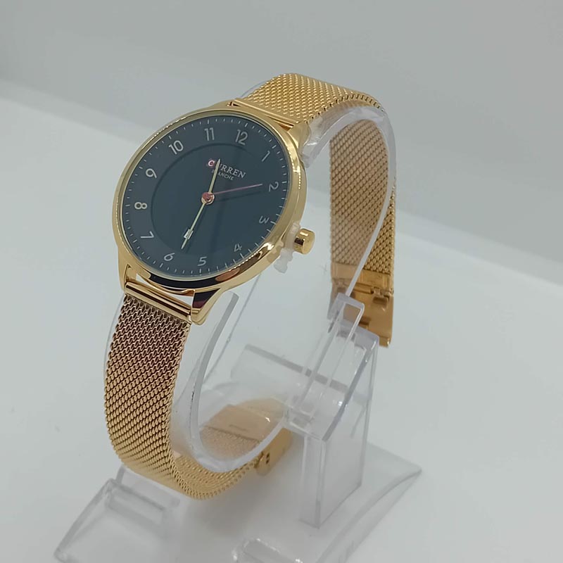 Προσιτό στυλ πολυτέλειας; Ναι, με αυτό το ρολόι χειρός γυναικείο της εταιρείας CURREN, με μηχανισμό quartz, μαύρο καντράν με χρυσαφί λεπτομέρειες , με χρυσαφί ευανάγνωστους αριθμούς, με μπρασελέ & κάσωμα απο ατσάλι τύπου ψάθα. (Το μπρασελέ είναι ρυθμιζόμενο και η διάμετρος κασώματος είναι 32 mm.)