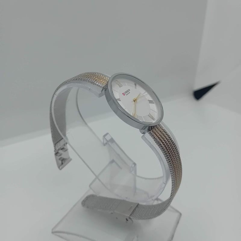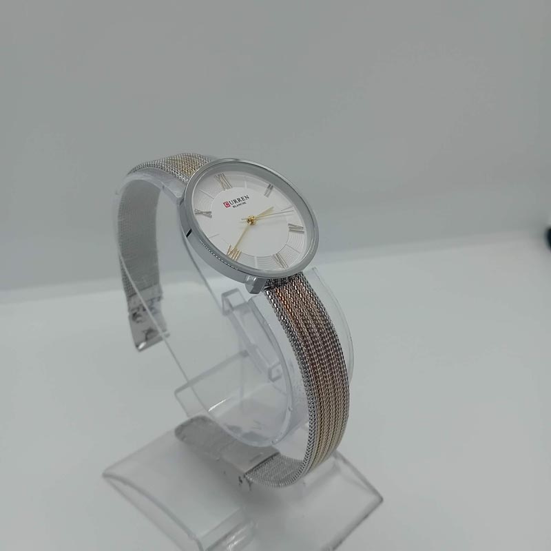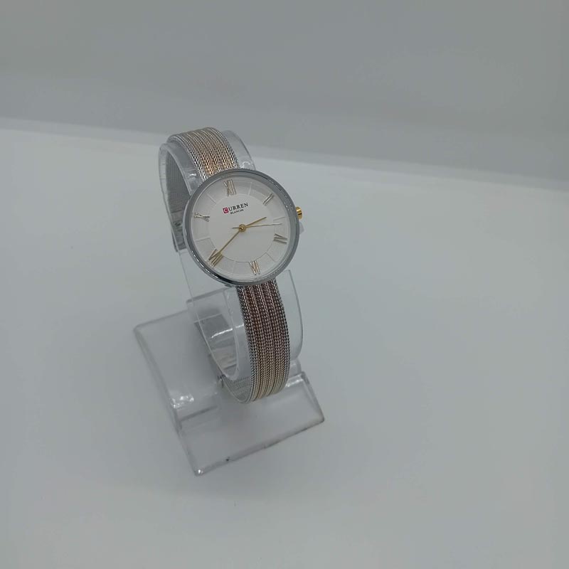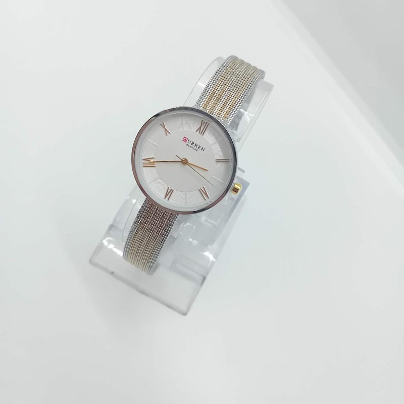 Όμορφο και εντυπωσιακό ΡΟΛΟΙ της εταιρείας CURREN, γυναικείο, με λευκό καντράν και χρυσαφί ΡΩΜΑΪΚΟΥΣ ΑΡΙΘΜΟΥΣ, με μηχανισμο quartz, με ρυθμιζόμενο μπρασελέ-κάσωμα απο ατσάλι διχρωμίας χρυσαφί-νίκελ. (διάμετρος κασωματος 32 mm)