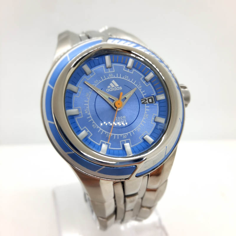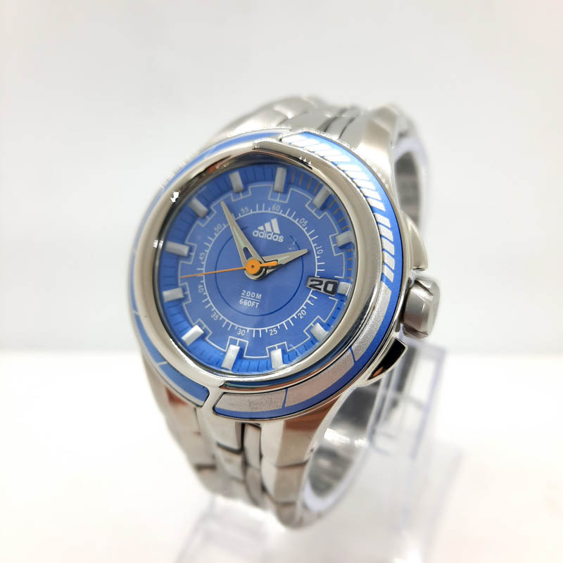 Ρολόι ανδρικό ADIDAS αδιάβροχο στα 200 μέτρα, με μπαταρία, από ανοξείδωτο ατσάλι , με διάμετρο κάσας 44 mm, με ημερομηνία, αναλογικό, με μπλε ραφ καντράν και φωσφοριζε σημεία, με διπλό ασφαλείας κούμπωμα μπλε στεφάνι στο κάσωμα, τζαμάκι από ορυκτό κρύσταλλο και βιδωτό καπάκι.