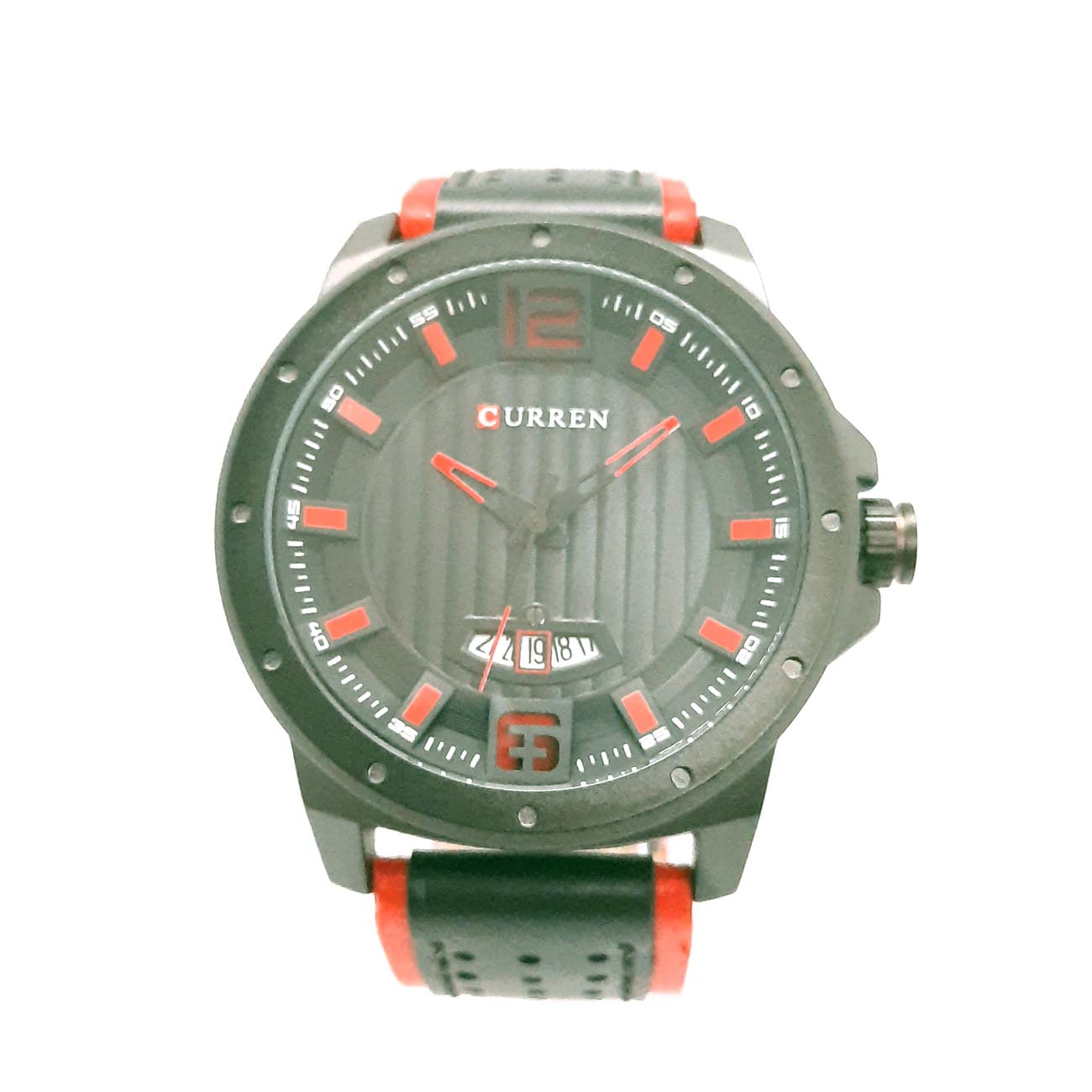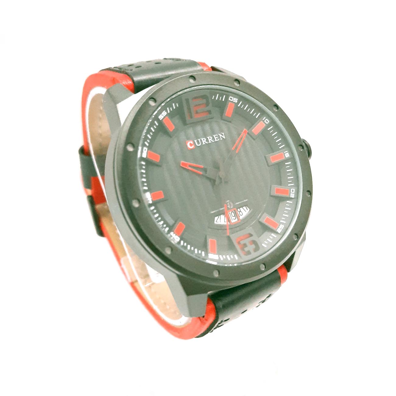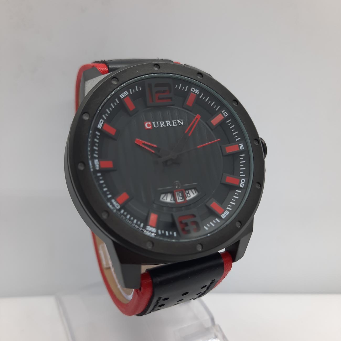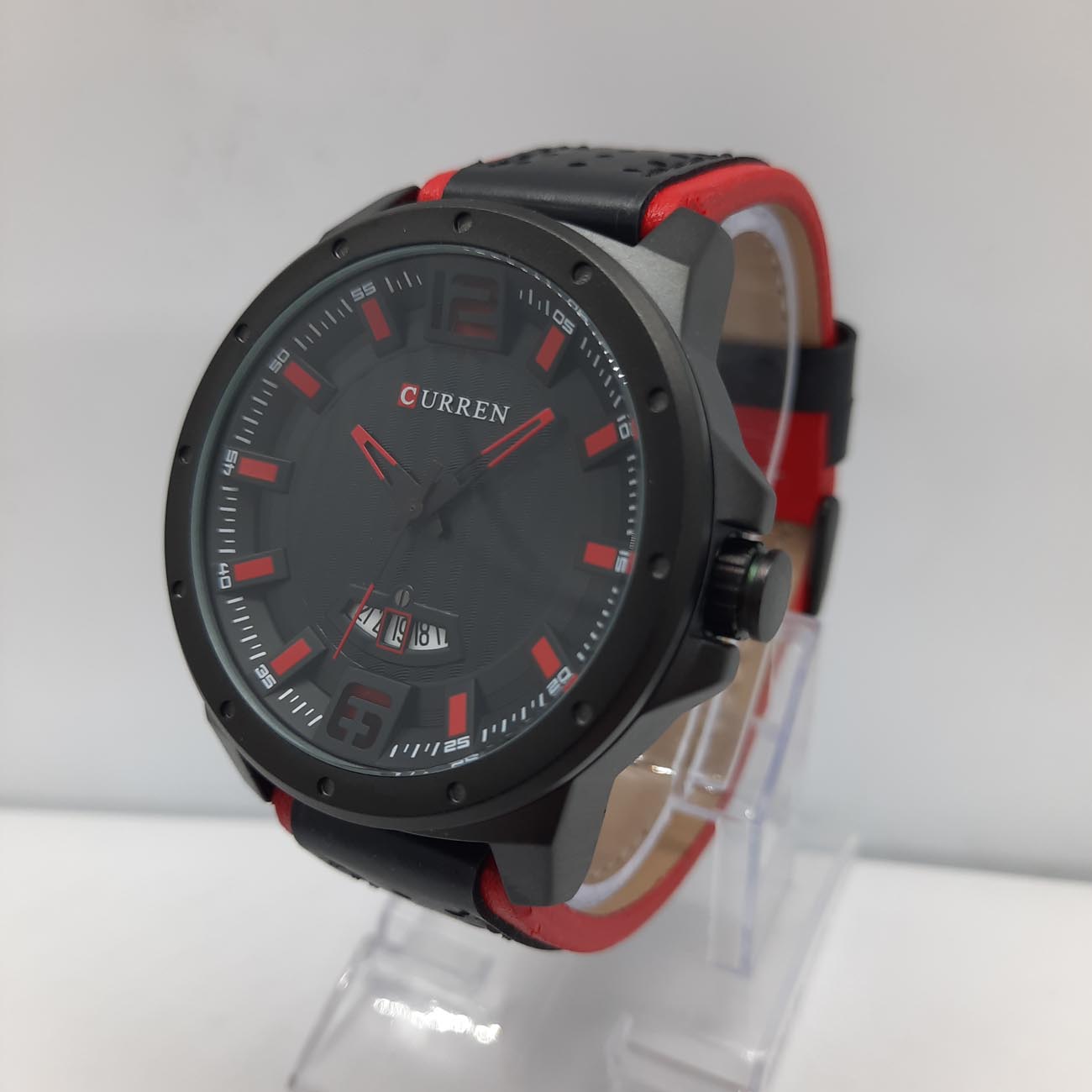 Πολύ μοντέρνο ρολόι αντρικό σε μαύρο χρώμα με κόκκινες λεπτομέρειες στο λουράκι, στους δείκτες και στο καντράν, μάρκα CURREN, με εντυπωσιακό στυλ στο καντράν με μαύρες κάθετες ρίγες.