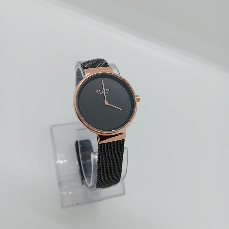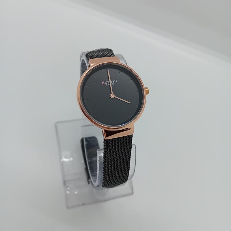 Πολύ σικ ρολόι γυναικείο, ατσάλι, με μαύρο καντράν σε καστόνι χρυσαφί απόχρωσης, με λεπτό μπρασελέ τύπου ψάθα επίσης σε μαύρη απόχρωση, με μπαταρία, μάρκα CURREN.