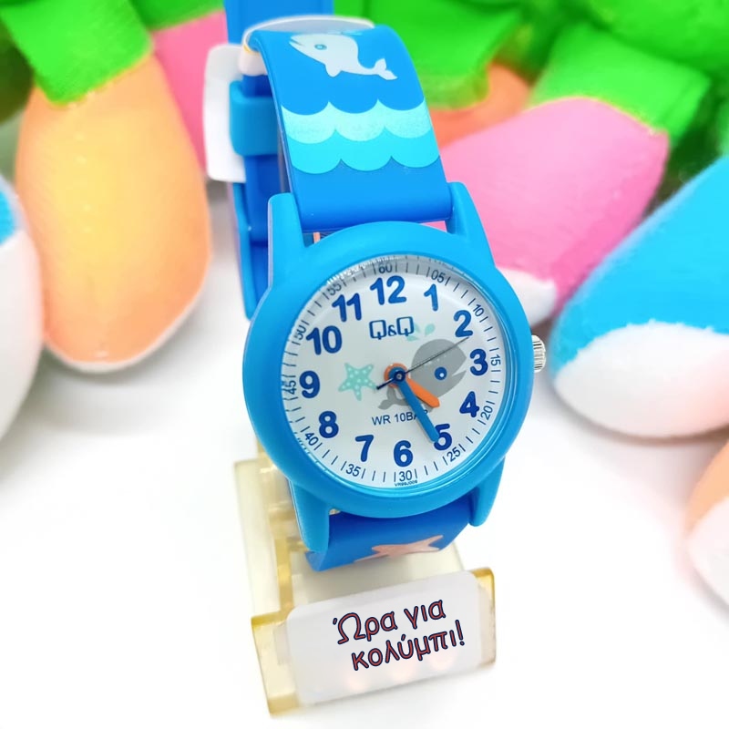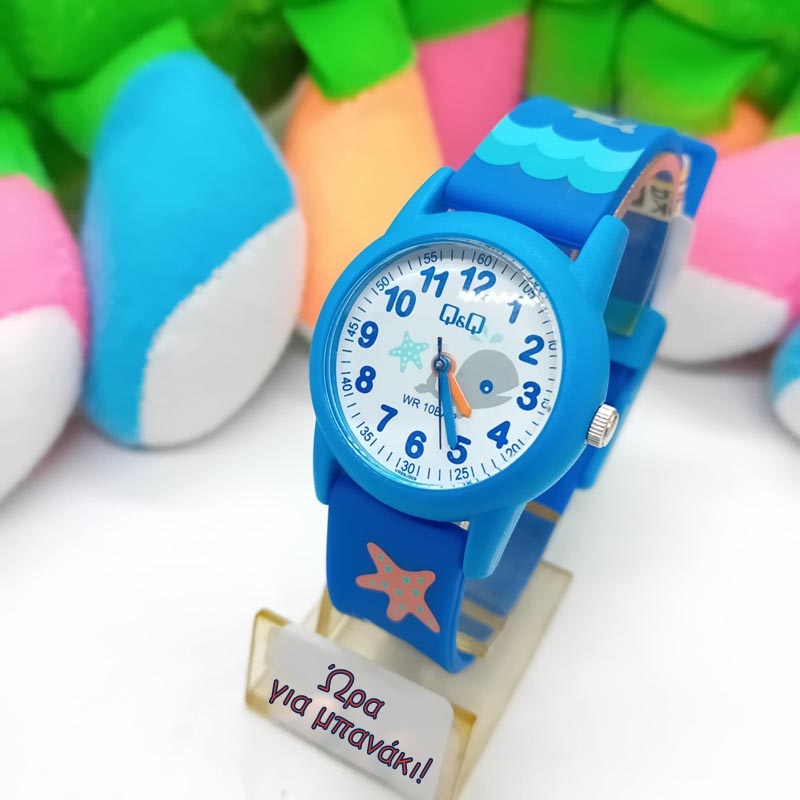 Αδιάβροχο παιδικό ρολόι στα 10 bar , από καλής ποιότητας υλικό , με χρώματα που ενθουσιάζουν τα παιδιά με θέμα την θάλασσα, με αστερία, φαλαινίτσα και κύματα, σε τόνους μπλε και γαλάζιους , με αριθμούς και δείκτες καθαρούς για να μπορέσουν τα παιδάκια να μάθουν τις ώρες , μάρκα Q&Q . Διάμετρος κάσας στα 30 mm.