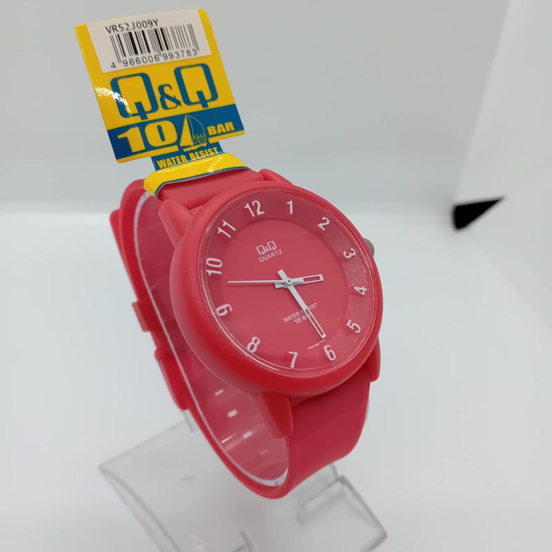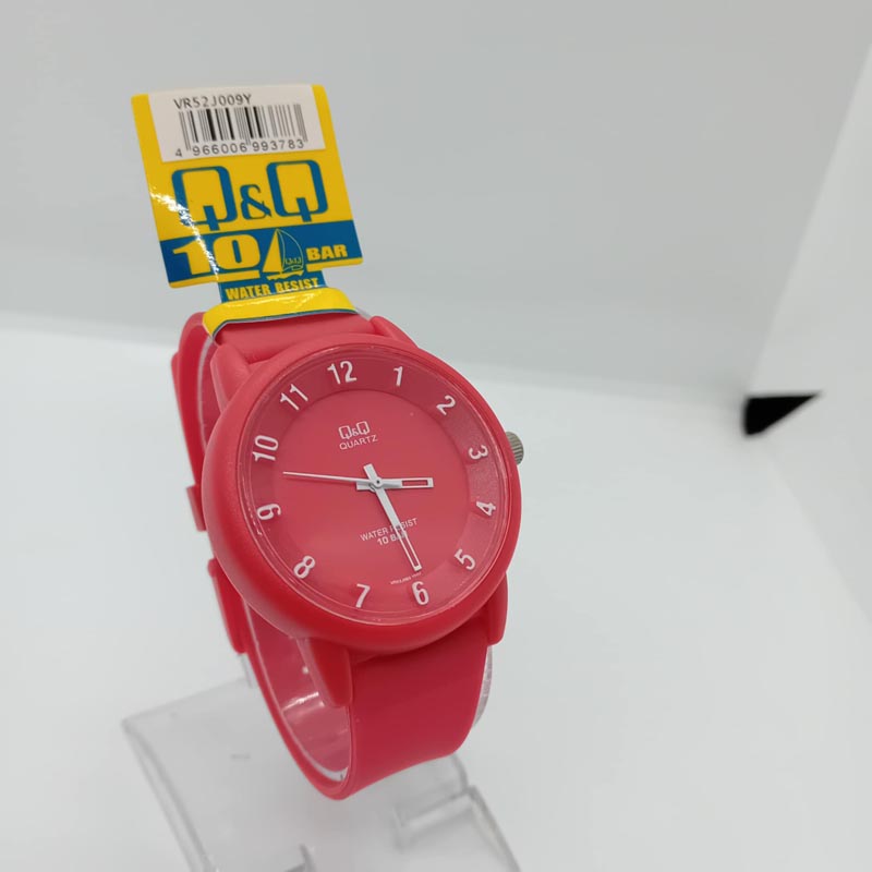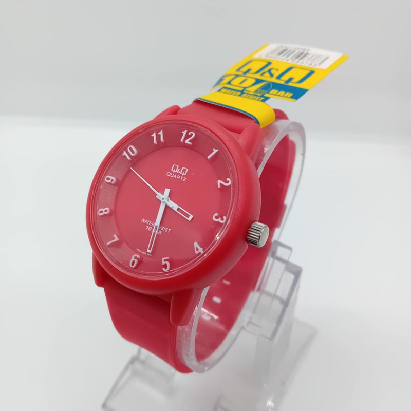 Για casual αθλητικό λούκ ρολόι χειρός με μεγάλο καντράν , λευκούς αριθμούς και λουράκι από καουτσούκ κόκκινο, της εταιρείας Q and Q .