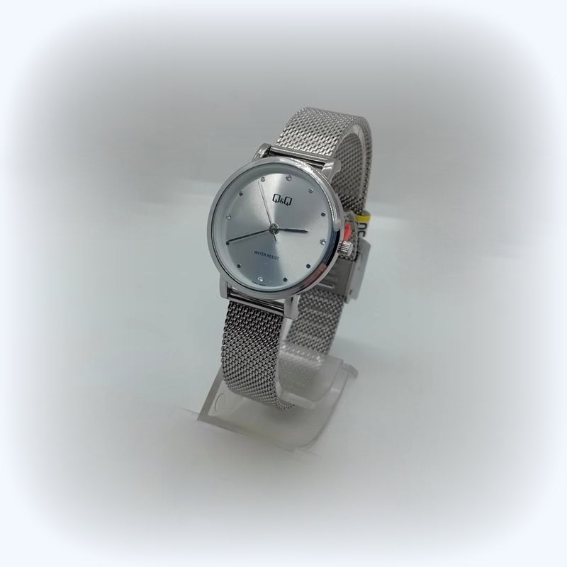 Πολύ κομψό ρολόι μάρκας Q&Q γυναικείο με λεπτό μπρασελέ "ψάθα" σε ασημί απόχρωση, με καντράν λευκό και με μικρά ζιργκονάκια αντί για αριθμούς, στεγανό σε πλύσιμο χεριών .