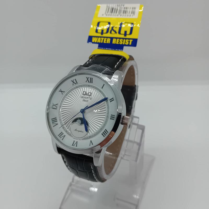 Ρολόι Q&Q , μεγάλο καντράν λευκό, με γραμμές, με λατινικούς αριθμούς, και moonface, δηλαδή δείχνει ημέρα και νύχτα) αδιάβροχο στα 50 μέτρα, με μαύρο δερμάτινο λουράκι με λευκά εξώραφα.