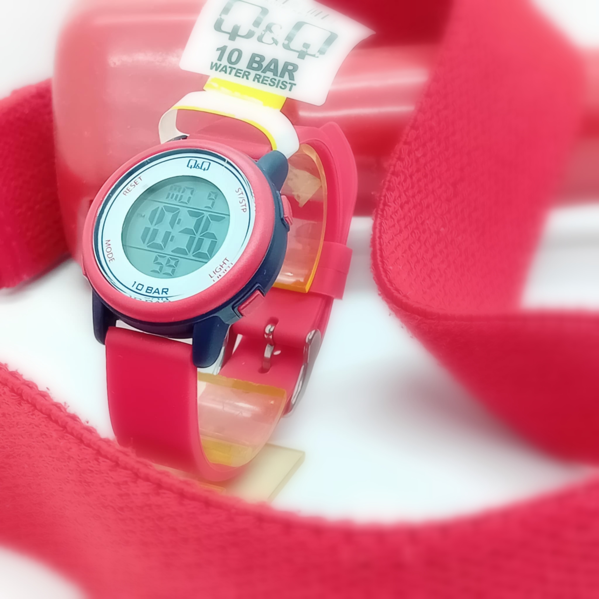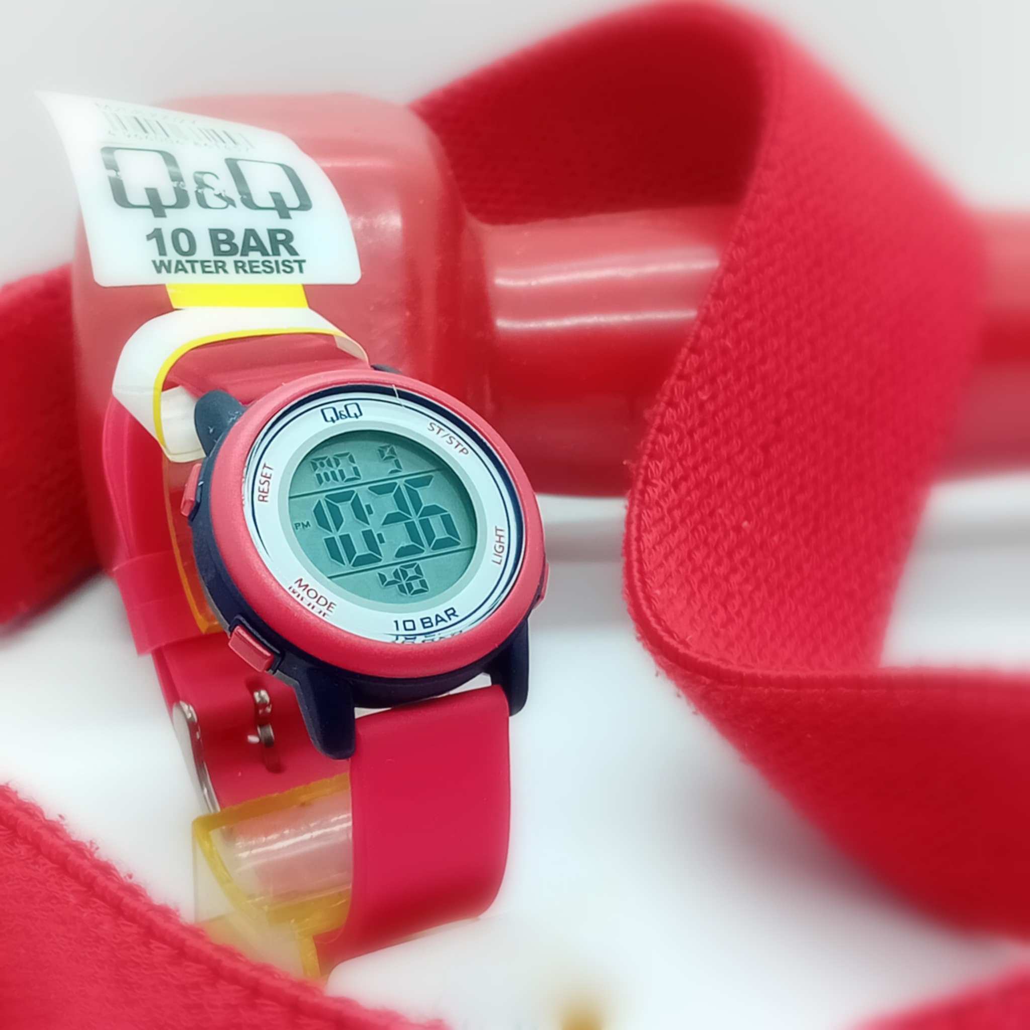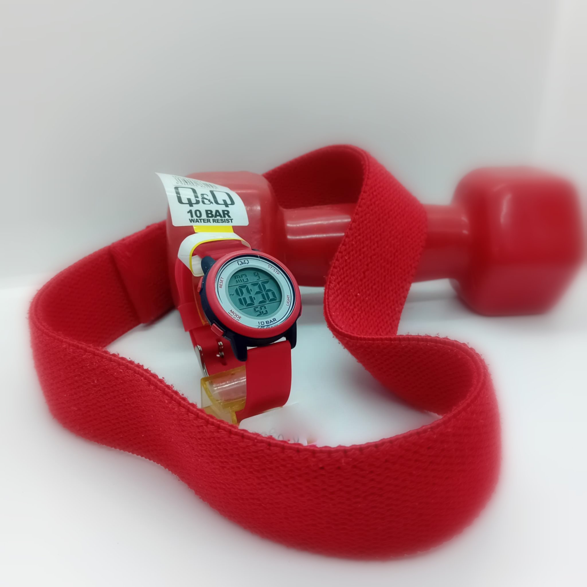 Ρολόι Q&Q sportif κόκκινο λουράκι σιλικόνης, στα 10 bar αδιάβροχο, με ξυπνητήρι, χρονόμετρο, ημερομηνία, 2η ψηφιακή ώρα και φως, βιδωτό καπάκι, με μπαταρία λιθίου.