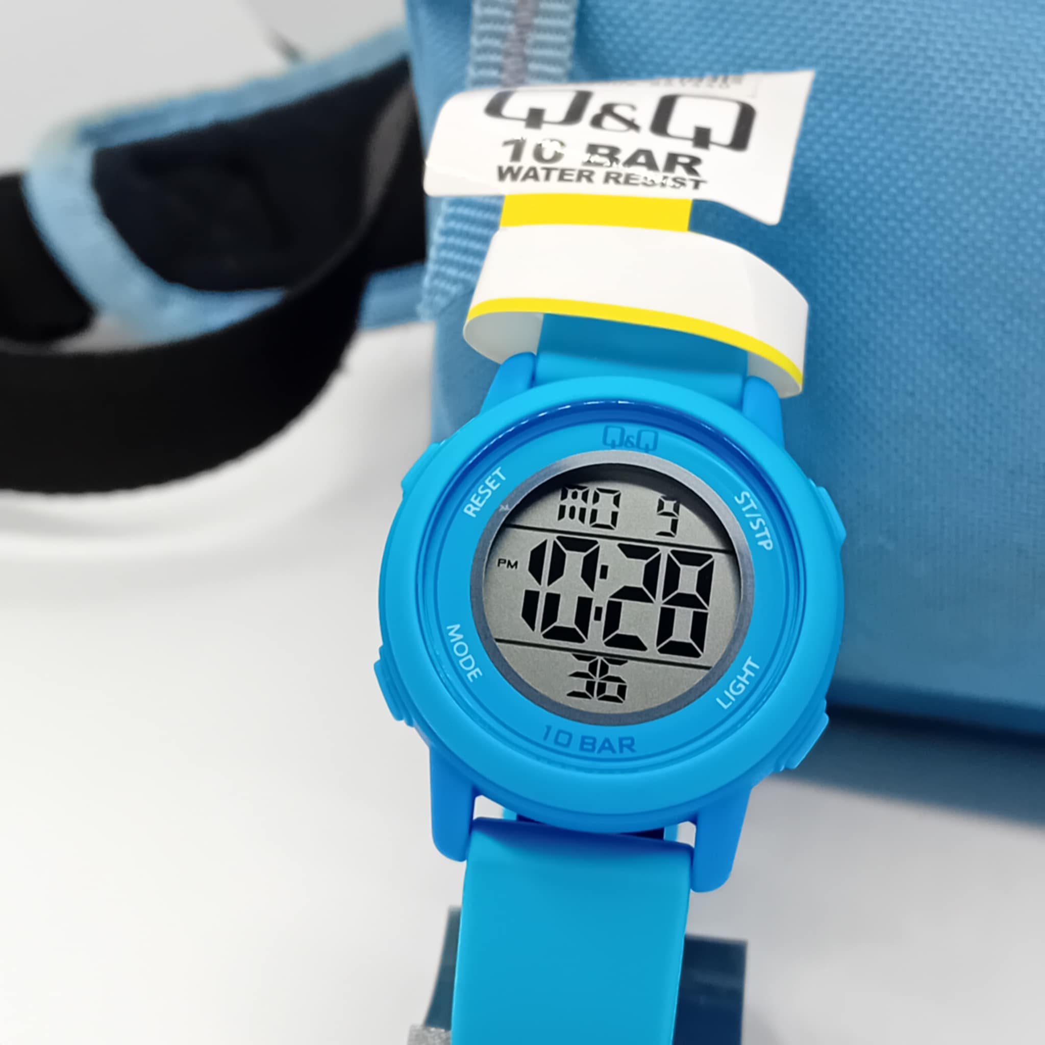 Ρολόι sportif γαλάζιο λουράκι σιλικόνης Q&Q στα 10 bar αδιάβροχο, με ξυπνητήρι, χρονόμετρο, ημερομηνία, 2η ψηφιακή ώρα και φως, βιδωτό καπάκι, με μπαταρία λιθίου.