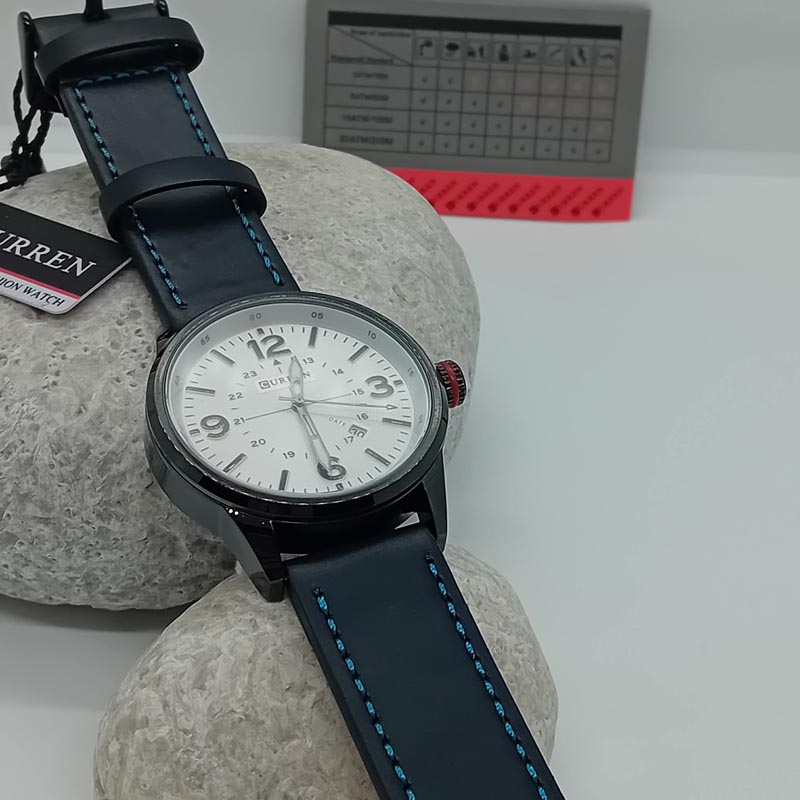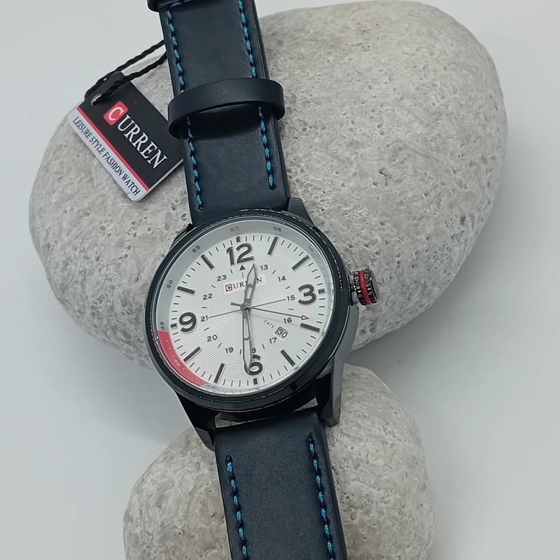 Casual εμφάνιση για τον άντρα με μοντέρνο ρολόι της εταιρείας CURREN με μαύρο λουράκι με μπλε εξώραφα, λευκό καντράν 44 mm διάμετρο, με ένδειξη ημερομηνίας, με quartz.