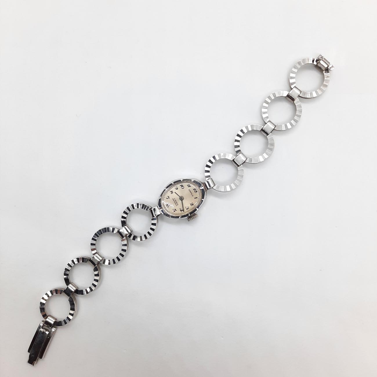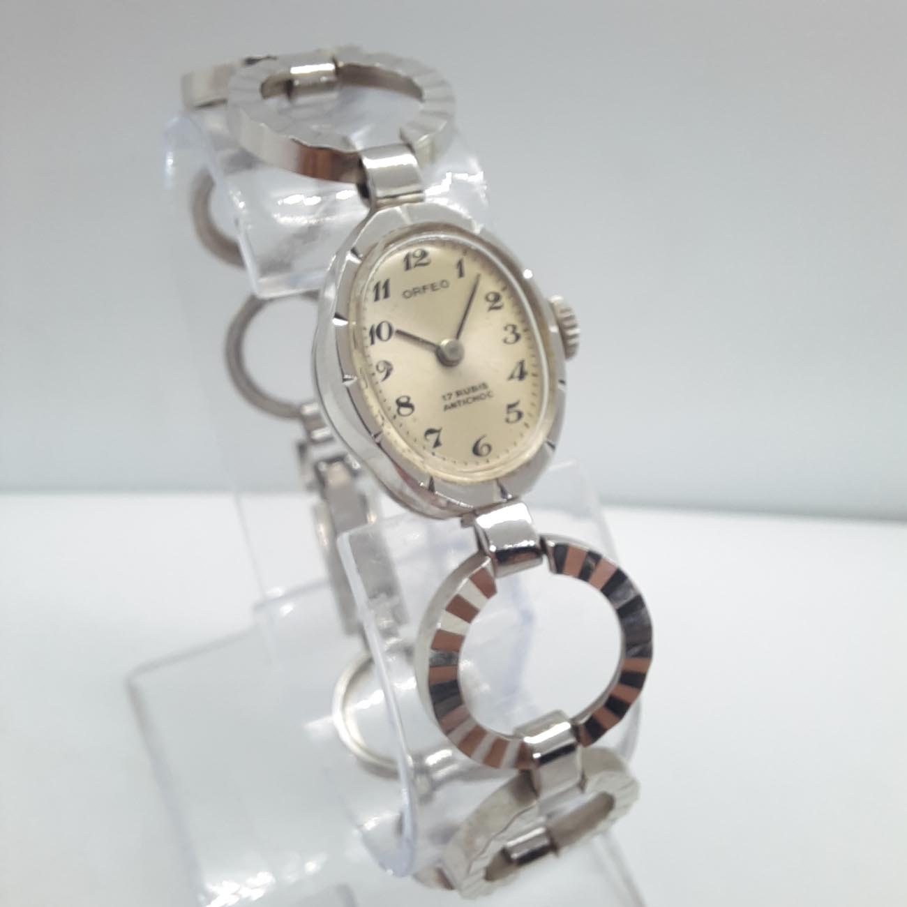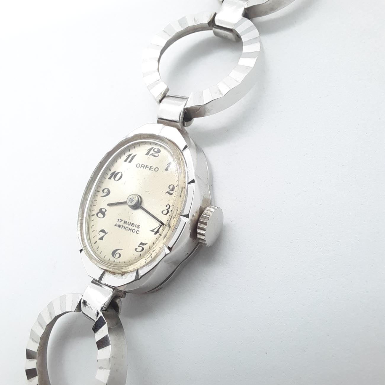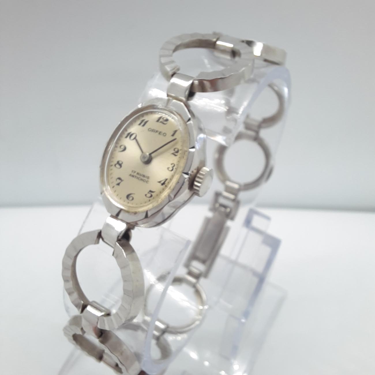 Κομψό,με πολύ θηλυκό design το vintage κουρδιστό ρολόι δεκαετίας 70-80, μάρκας ORFEO, μπρασελέ με δυνατότητα προσαρμογής στον καρπό σας, με επινικέλωση, χώρα κατασκευής ΕΛΒΕΤΙΑ, με 17 ΡΟΥΜΠΙΝΙΑ, μηχανισμός με σύστημα incablog, antimagnetic, antichoc . (Το προϊόν ΔΕΝ είναι second hand.)