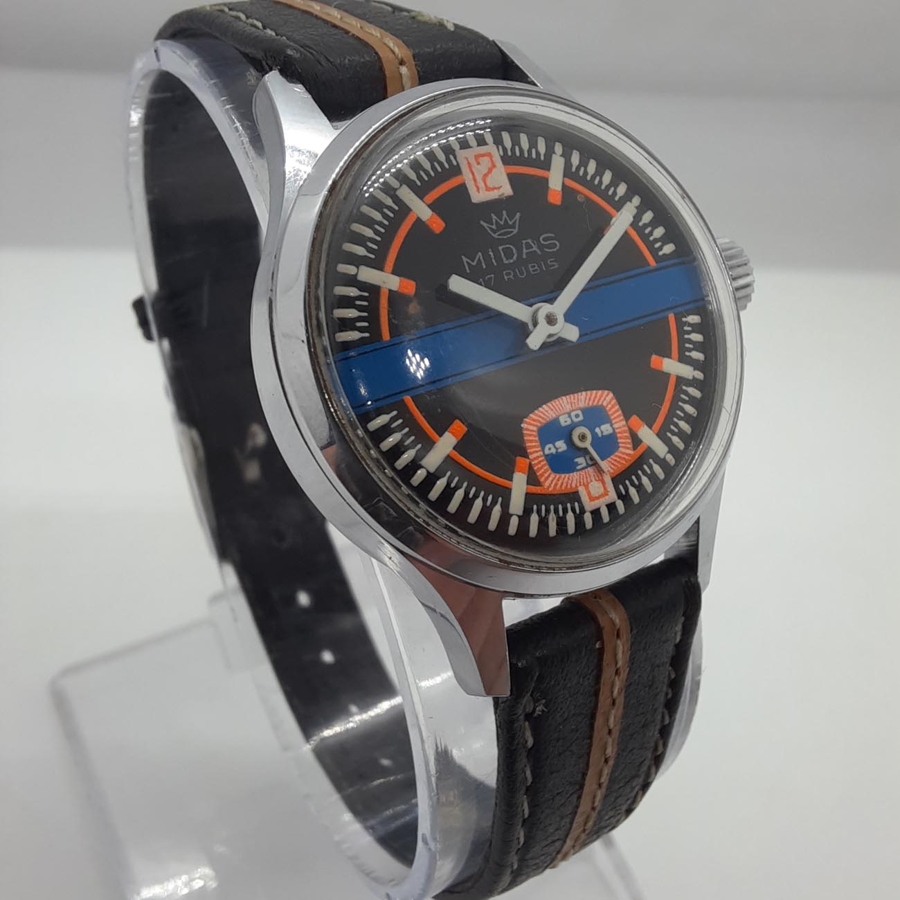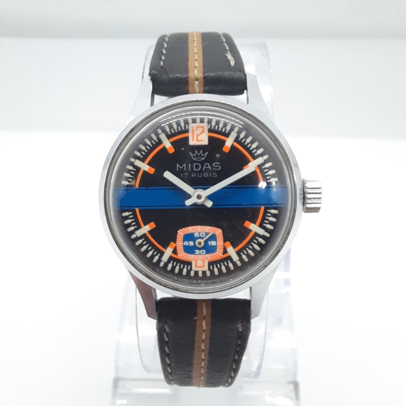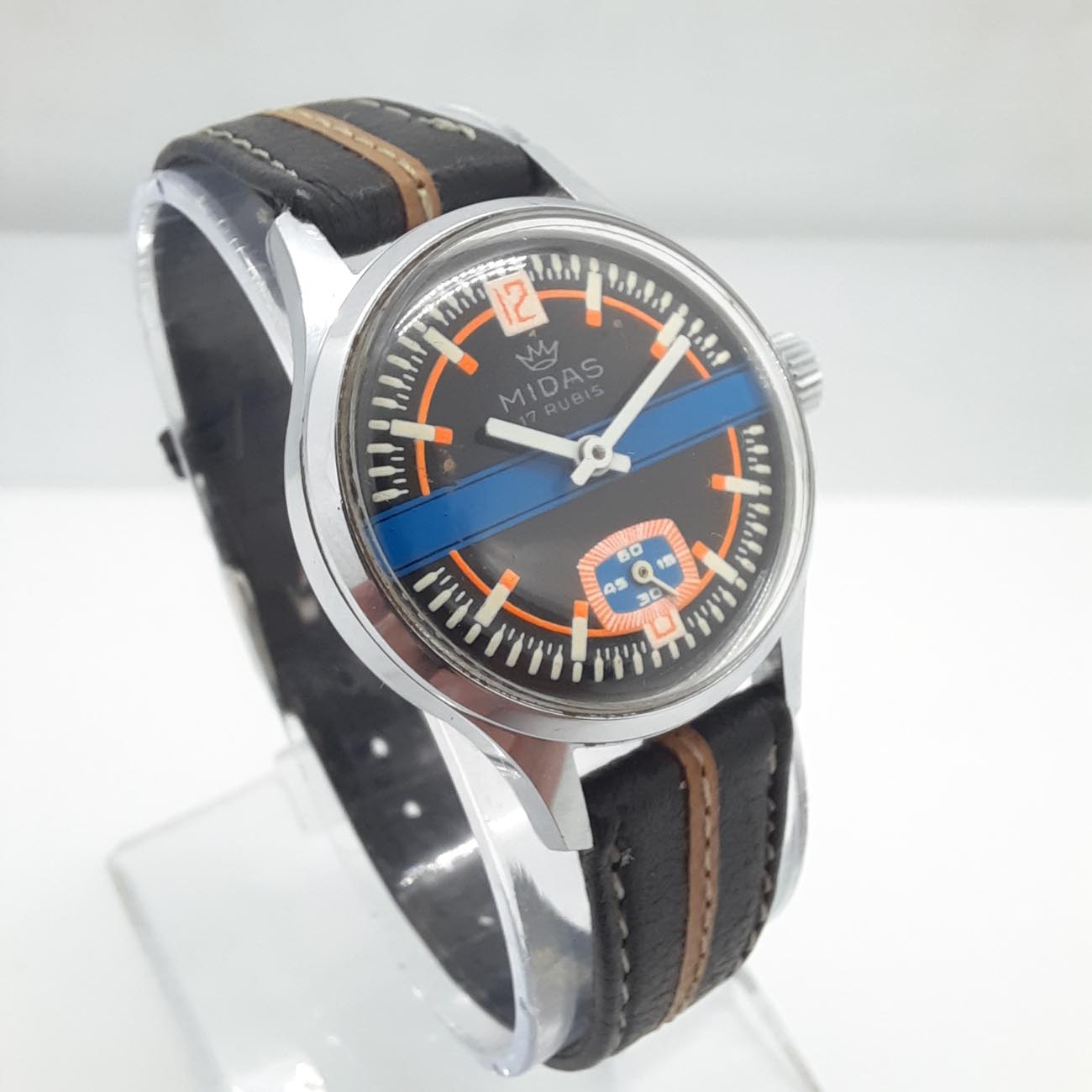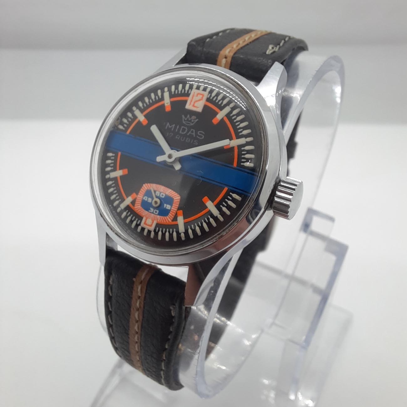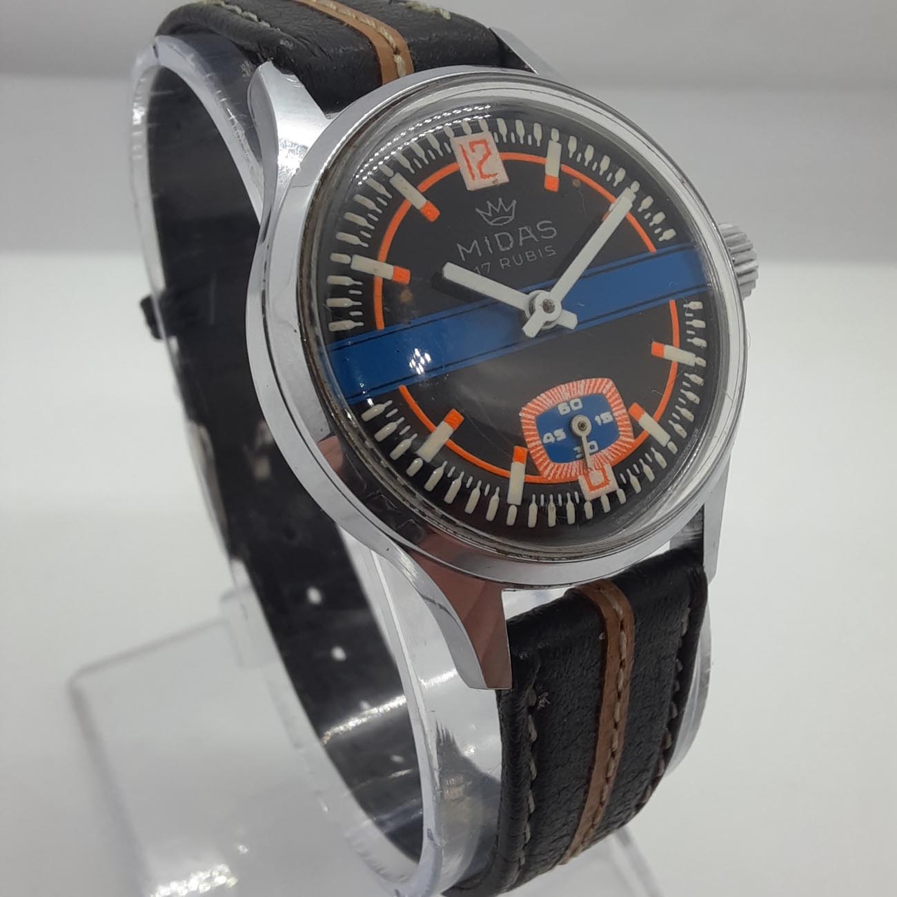 Vintage ρολόι MIDAS, ελβετικό, με δερμάτινο δίχρωμο λουράκι σε απόχρωση του καφέ, με ατσάλινο χρωμιωμένο κάσωμα, ιδανικό για σπορ εμφανίσεις, με μηχανισμό κουρδιστό διαρκείας 24 ωρών και κούμπωμα ασφαλείας, μοντέρνο σπόρ καντράν με λεπτομέρειες πορτοκαλί και μπλε.